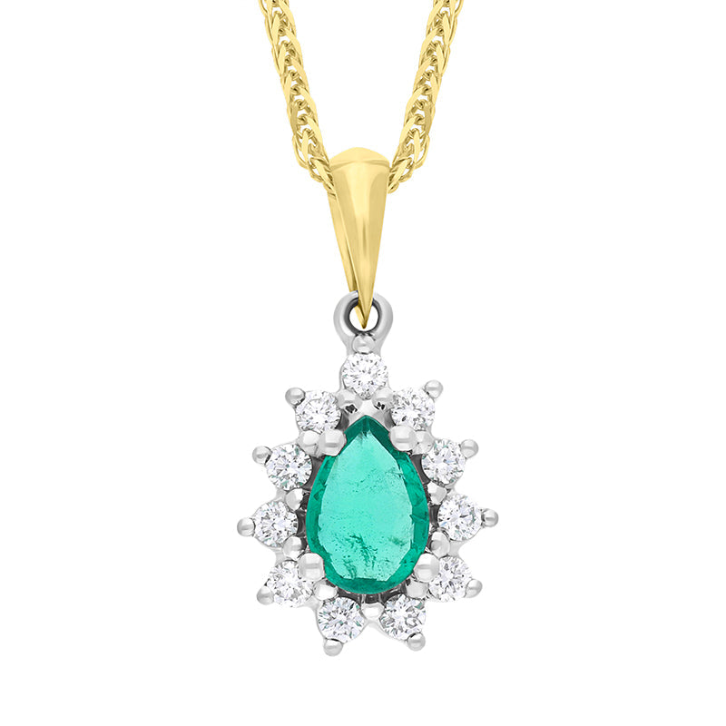 18ct Yellow and White Gold Emerald Diamond Cluster Pear Cut Pendant - FEU-2842 (FEU-2842)