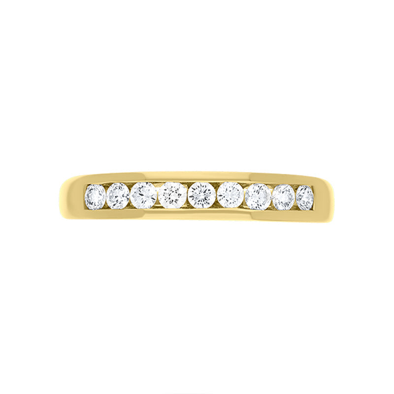 This stunning half eternity band ring features nine brilliant cut diamonds, with a total diamond weight of 0.30cts, which are channel set on a classic yellow gold band. Designed perfectly for everyday wear, this diamond set piece would make the perfect engagement or eternity ring to sit comfortably alongside a wedding band.