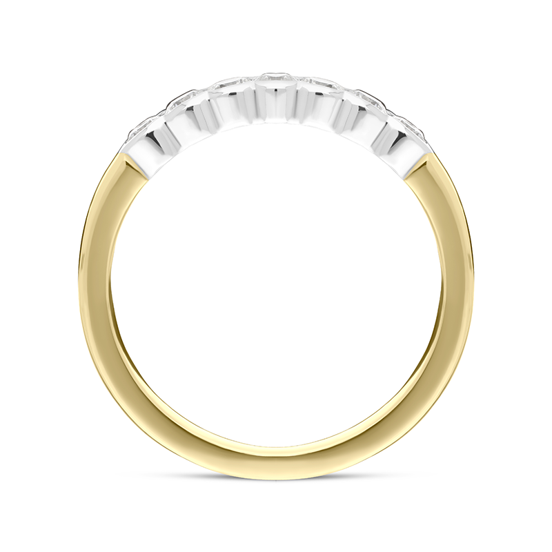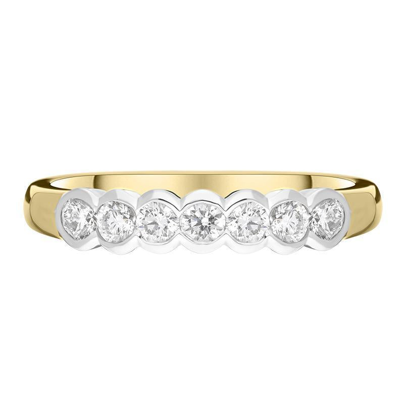 This stunning 18ct yellow gold half eternity ring is beautifully adorned with 7 sparkling brilliant cut diamonds, totalling 0.44cts, individually bezel set into an 18ct white gold setting. This feminine diamond set 18ct yellow gold ring has a slim design to sit perfectly along side other bands.