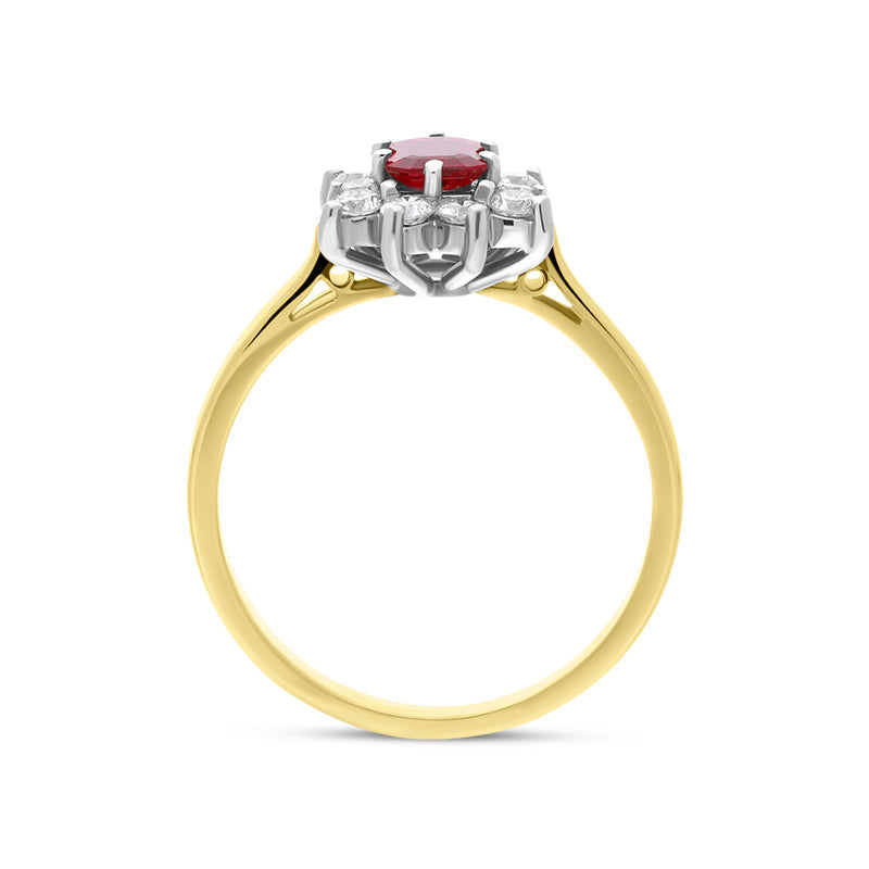 This elegant 18ct yellow gold ring features a stunning 0.46ct emerald cut ruby which is encompassed by a star-like cluster of sparkling brilliant cut diamonds, totalling 0.38cts. The precious gemstones are claw set within 18ct white gold, allowing for the maximum amount of light to travel through the stones. Designed perfectly for everyday wear, this gemstone set piece would make the perfect engagement or dress ring to sit comfortably alongside other bands.