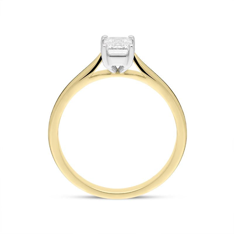 An embodiment of elegance and luxury, this 18ct yellow gold ring features a solitaire emerald cut diamond, totalling 0.51cts. The diamond is claw set within 18ct white gold, allowing the maximum amount of light to travel through and accentuating the sparkle. Designed perfectly for everyday wear, this diamond set piece would make the perfect engagement ring to sit comfortably alongside a wedding band.