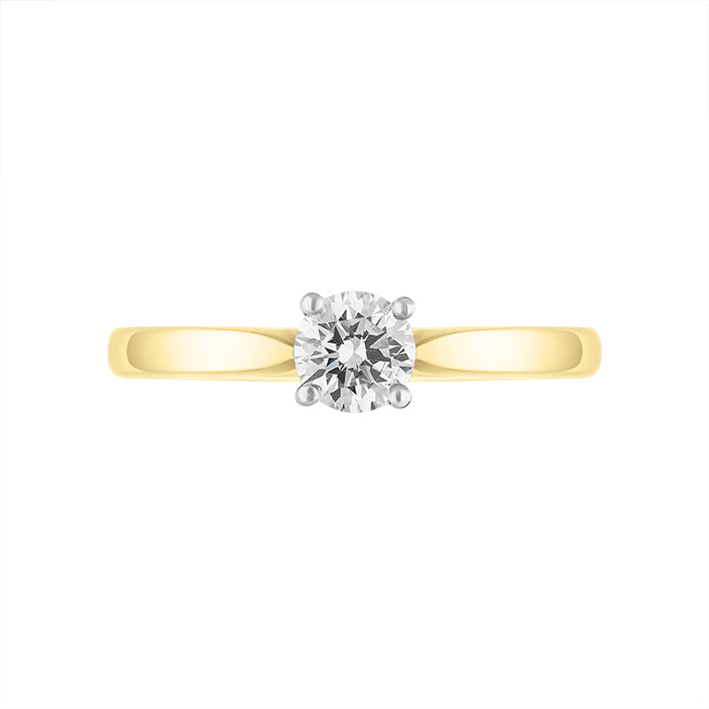 Classically elegant, this 18ct yellow gold ring features a glittering 0.70ct round brilliant cut diamond, chosen for its fire and brilliance. The rare white diamond is claw set in 18ct white gold, allowing maximum light to enter and illuminate the beautiful stone.