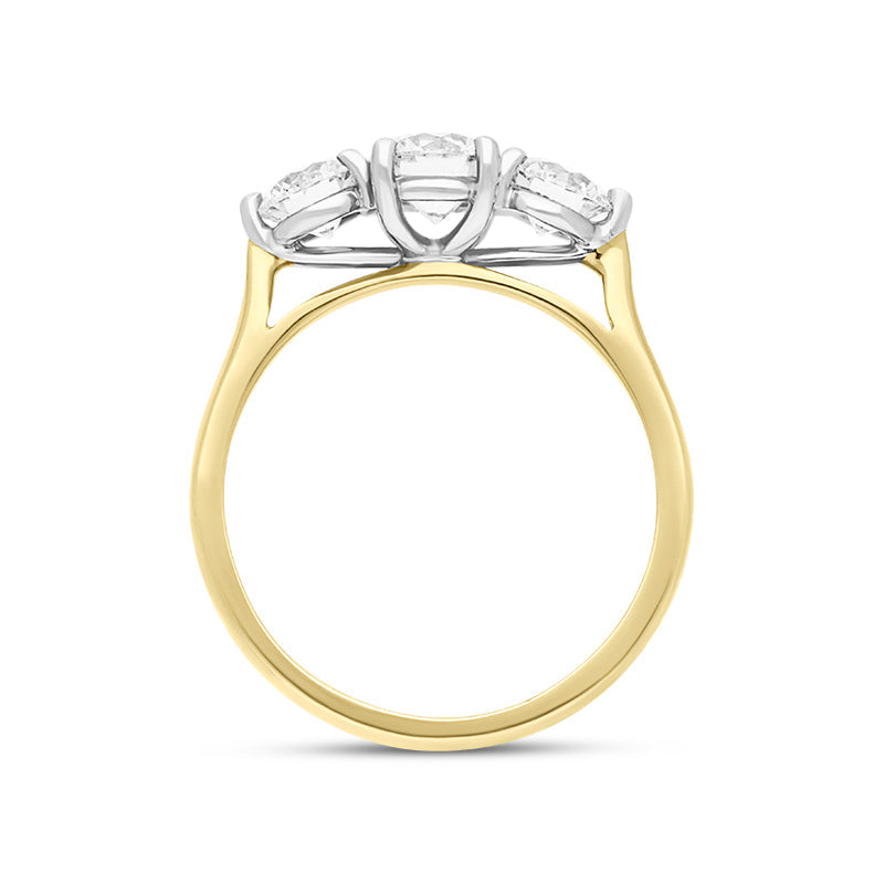This stunning 18ct yellow gold ring features three round brilliant cut diamonds (centre 0.80ct, outer 0.70ct, total 1.50ct), set in 18ct white gold. The 18ct yellow gold band gives this beautiful ring a solid and substantial weight, making this a piece that will be treasured for generations to come.