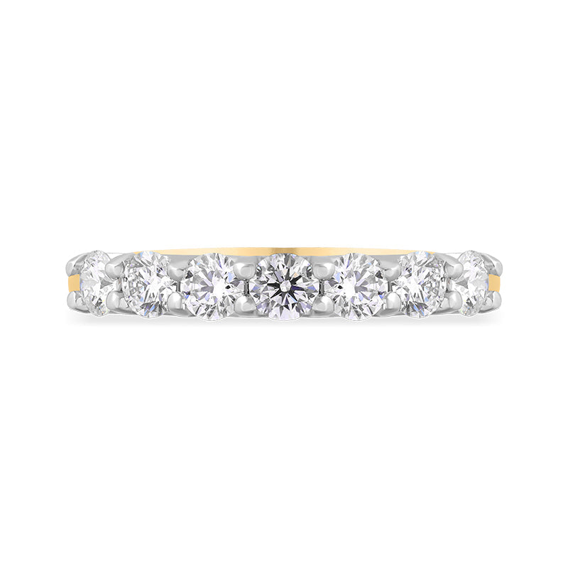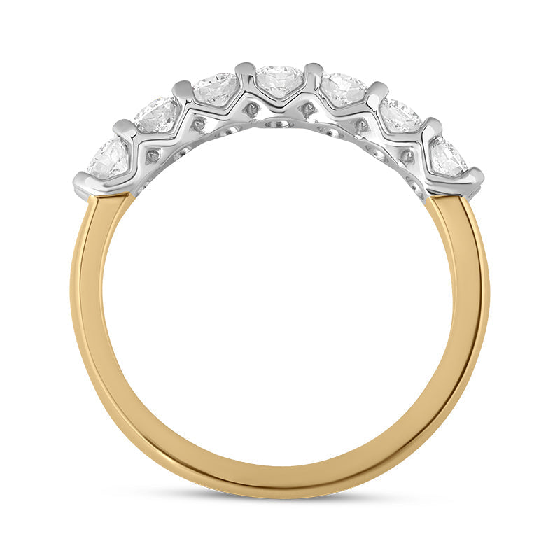This stunning 18ct yellow gold ring features seven brilliant cut diamonds totalling 0.76ct. The diamonds are claw set in platinum for a glittering finish. The 18ct yellow gold band gives this beautiful ring a solid and substantial weight, making this a piece that will be treasured for generations to come.
