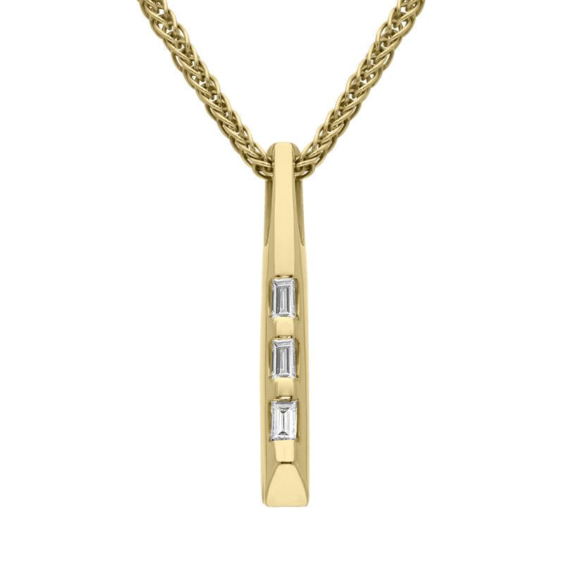 An embodiment of elegance and luxury, this classic pendant features a modern bar design which is adorned by 3 baguette cut diamonds. The sparkling diamonds are held in an 18ct yellow gold setting and the pendant is completed with an 18ct yellow gold chain.