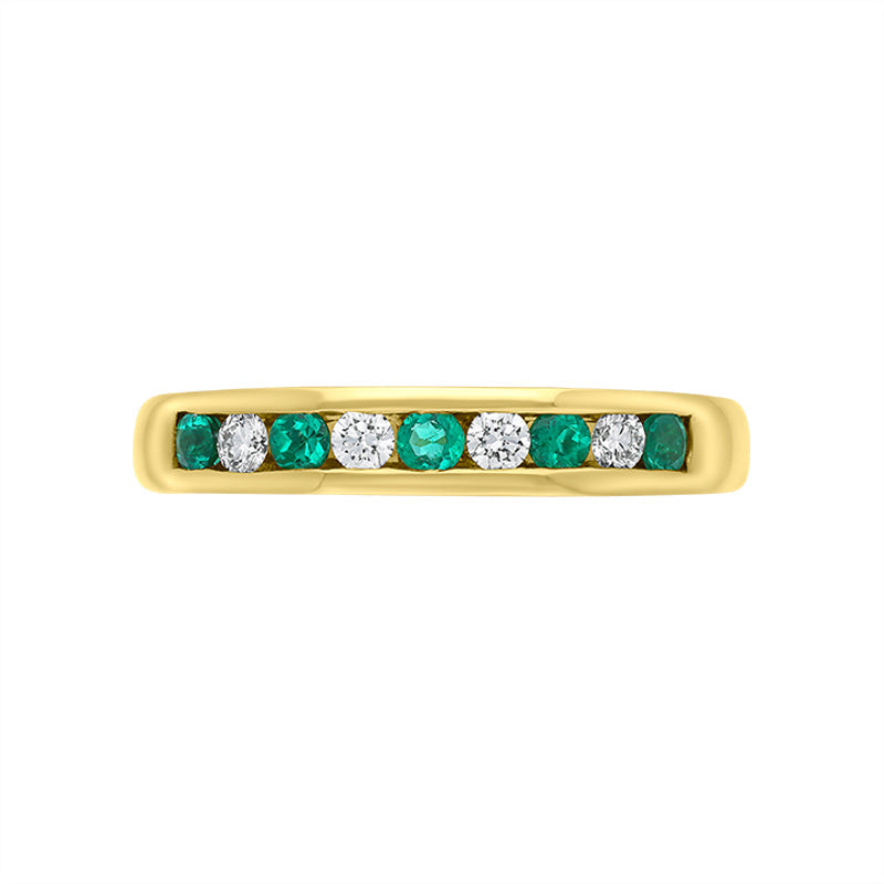 An embodiment of feminine style, this 18ct yellow gold 9 stone half eternity ring features alternating round cut emeralds, totalling 0.19ct, and sparkling brilliant cut diamonds, totalling 0.13ct. The precious gemstones are channel in a classic 18ct yellow gold band, giving the ring a solid, substantial feel and making this a piece that will be treasured for generations to come. Designed perfectly for everyday wear, this gemstone set piece would make the perfect wedding or eternity ring to sit comfortably alongside other bands.