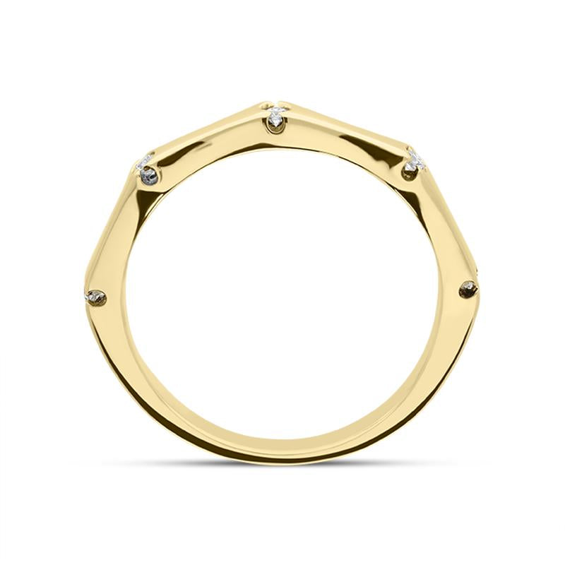 Elegant and minimalist, this stunning band ring is finely crafted from 18ct yellow gold and features five brilliant cut diamonds, set into the pentagon shaped band, offering a contemporary twist to this exquisite and timeless piece. The solid 18ct yellow gold ring features a slim design, making it the perfect dress ring to wear alongside other styles.
