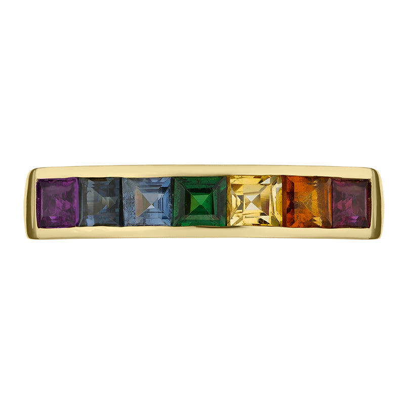 This seven stone half eternity style ring features stunning princess cut sapphires totalling 1.28cts in a rainbow of colours. The sparkling precious stones are channel set within a classic 18ct yellow gold band, which gives this beautiful ring a solid and substantial weight, making this a piece that will be treasured for generations to come.