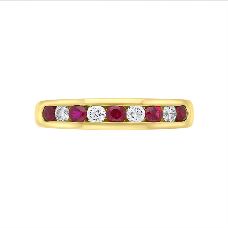 18ct Yellow Gold Ruby Diamond Channel Set Half Eternity Ring, FEU-2435