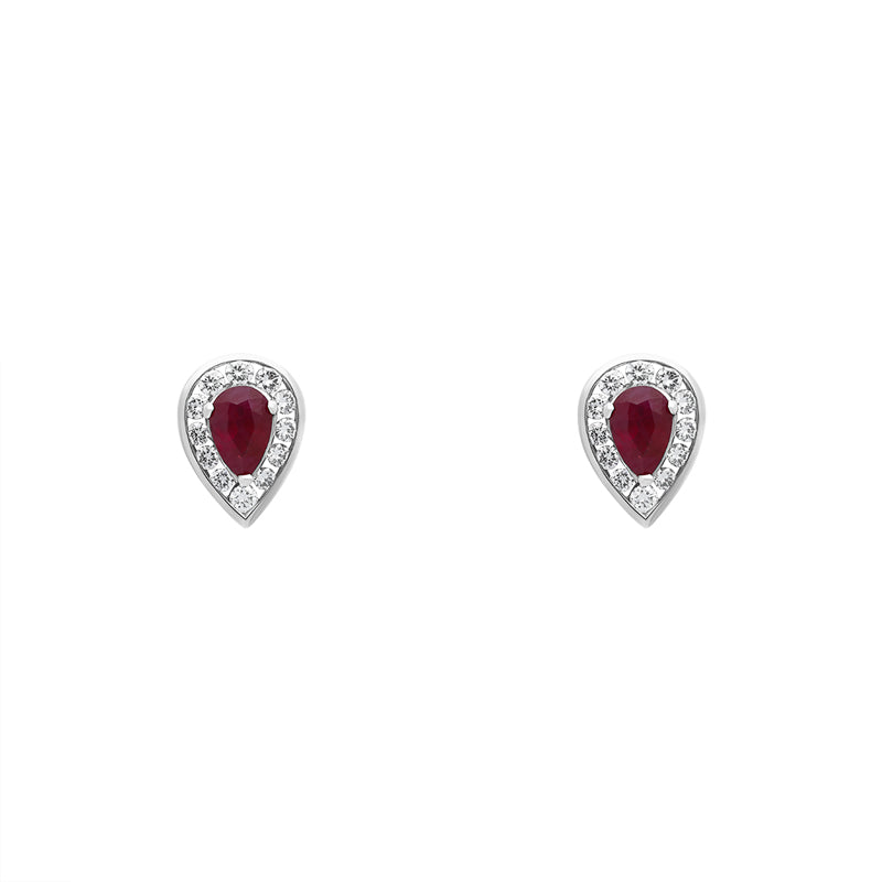 An embodiment of elegance and luxury, these luxurious 18ct gold stud earrings feature pear cut rubies (1.07ct total) and diamonds (0.42ct total) set in 18ct white gold. They have secure post and butterfly style fastenings.