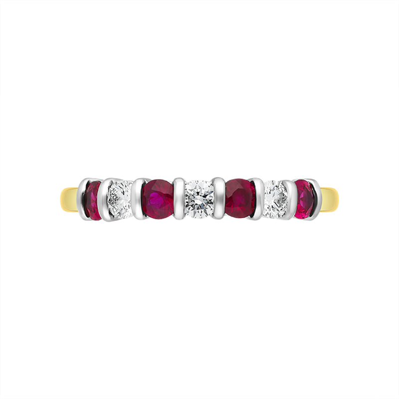 This stunning seven stone half eternity ring features alternating brilliant cut diamonds, totalling 0.32ct, and elegant rubies, totalling 0.72ct. The sparkling precious stones are bar set in 18ct white gold on a classic 18ct yellow gold band, giving this ring a solid and substantial weight and making this a piece that will be treasured for generations to come.