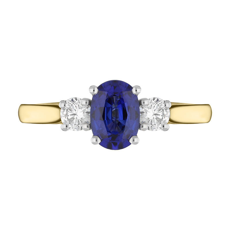 An embodiment of elegance and luxury, this stunning 18ct yellow gold ring features an oval cut central sapphire (0.96ct), shouldered eitherside by two round brilliant cut diamonds (0.29ct), which have been claw set in 18ct white gold. Designed perfectly for everyday wear, this sapphire and diamond set piece would make the perfect engagement ring to sit comfortably alongside a wedding band.