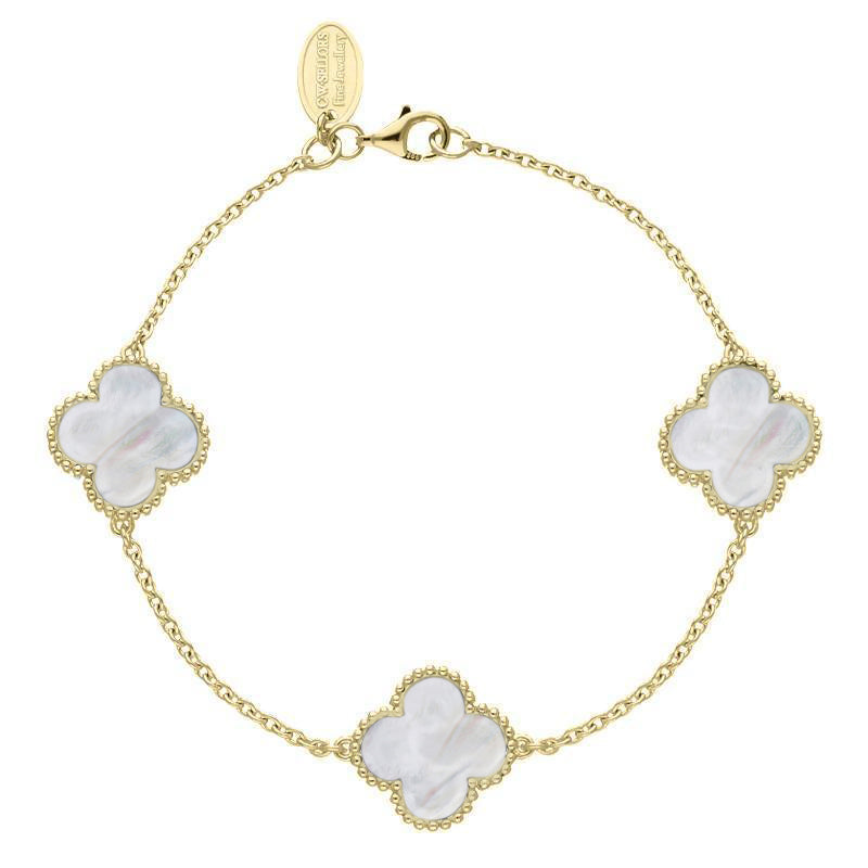 18ct Yellow Gold White Mother of Pearl Bloom Four Leaf Clover Ball Edge Chain Bracelet - B1153 (BLM-350)