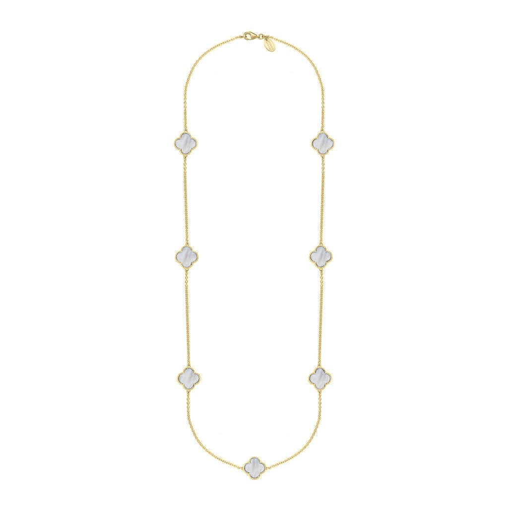 18ct Yellow Gold White Mother of Pearl Bloom Four Leaf Clover Ball Edge Long Necklace - N1040 (BLM-413)