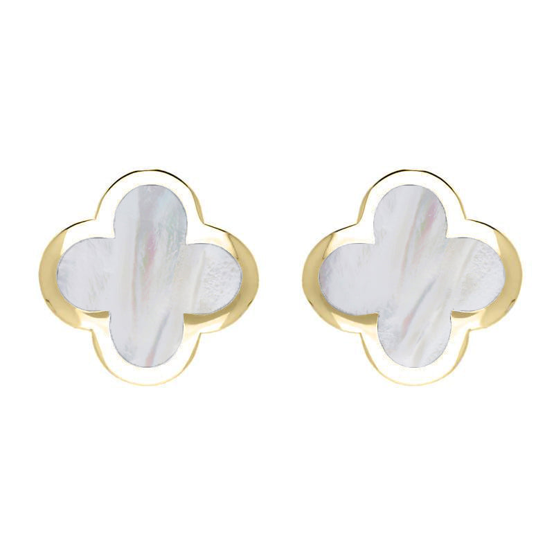 18ct Yellow Gold White Mother of Pearl Bloom Four Leaf Clover Stud Earrings - E2465 (BLM-392)