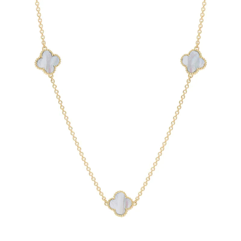 18ct Yellow Gold White Mother of Pearl Bloom Four Leaf Clover Ball Edge Necklace - N1154 (BLM-462)