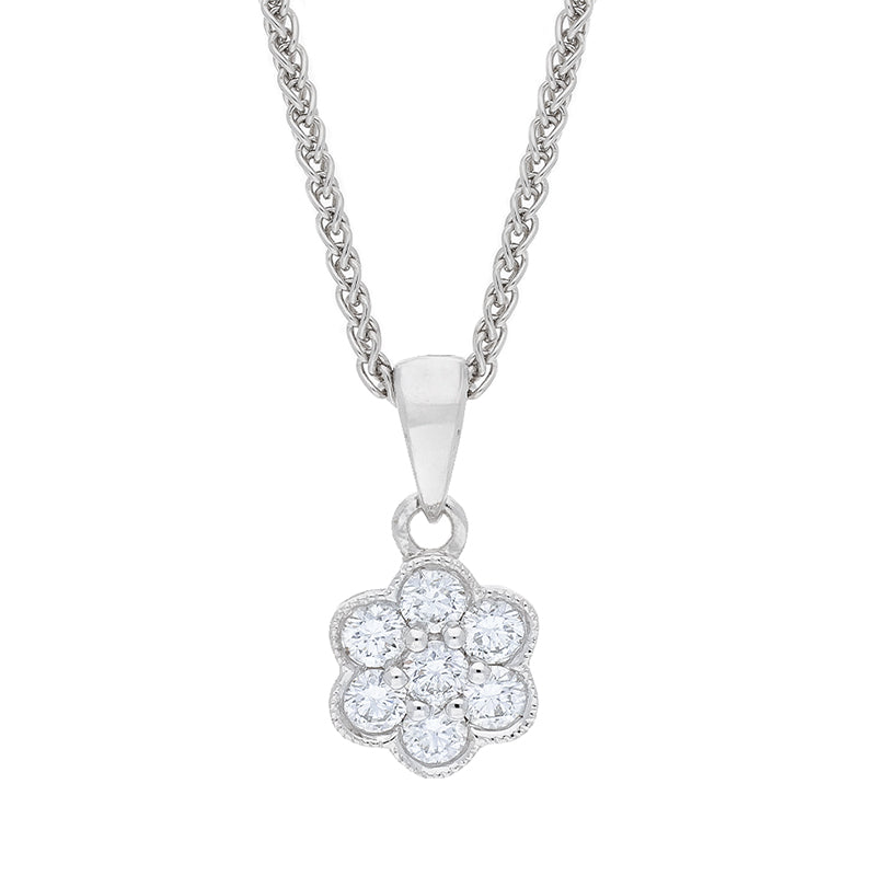 This 18ct white gold pendant and chain feature a stunning 0.24ct diamond Millgrain cluster.