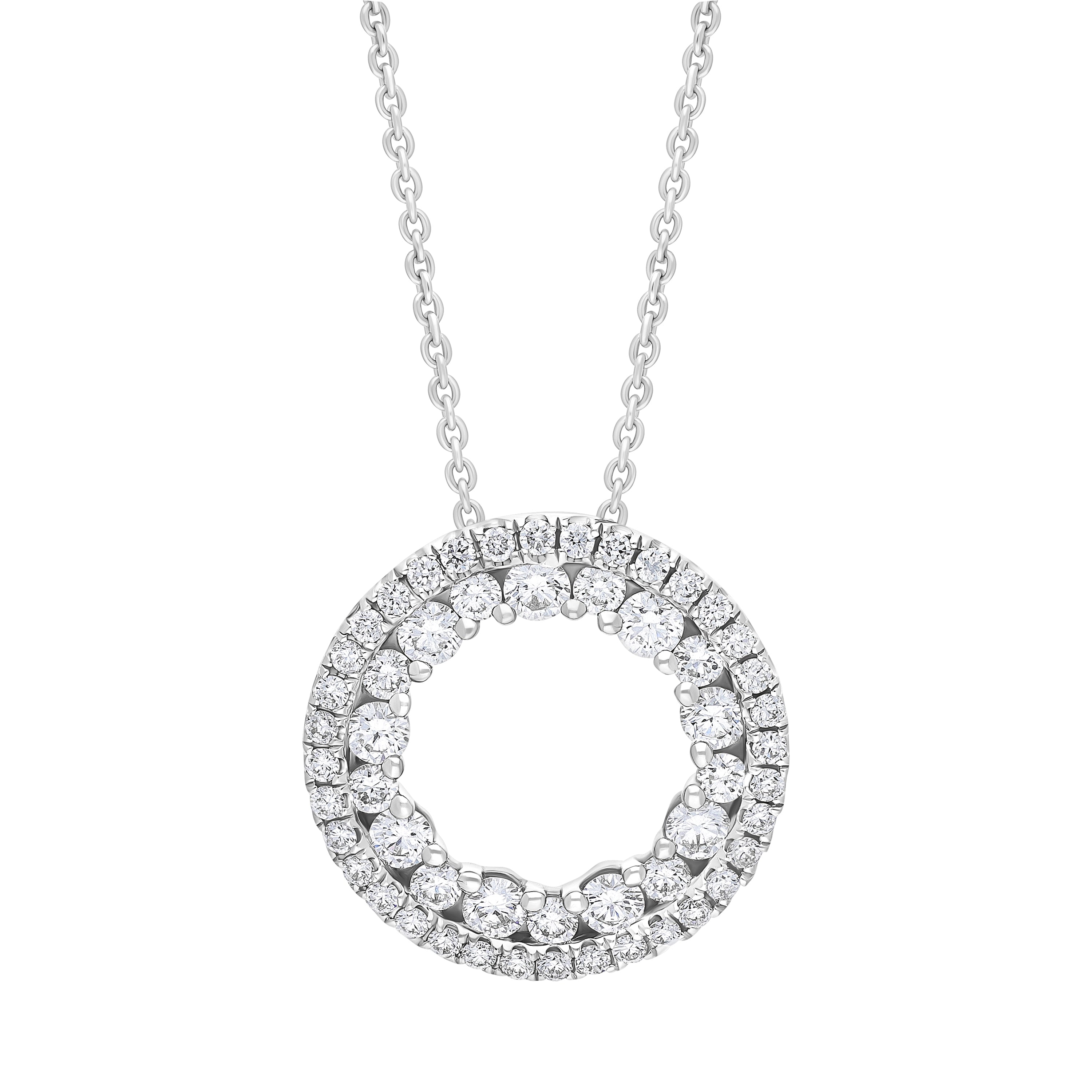 This 18ct white gold pendant has two rows of dazzling white brilliant cut diamonds totalling 0.56ct embellishing the open circle design. Completed with a contrasting 18ct white gold chain.