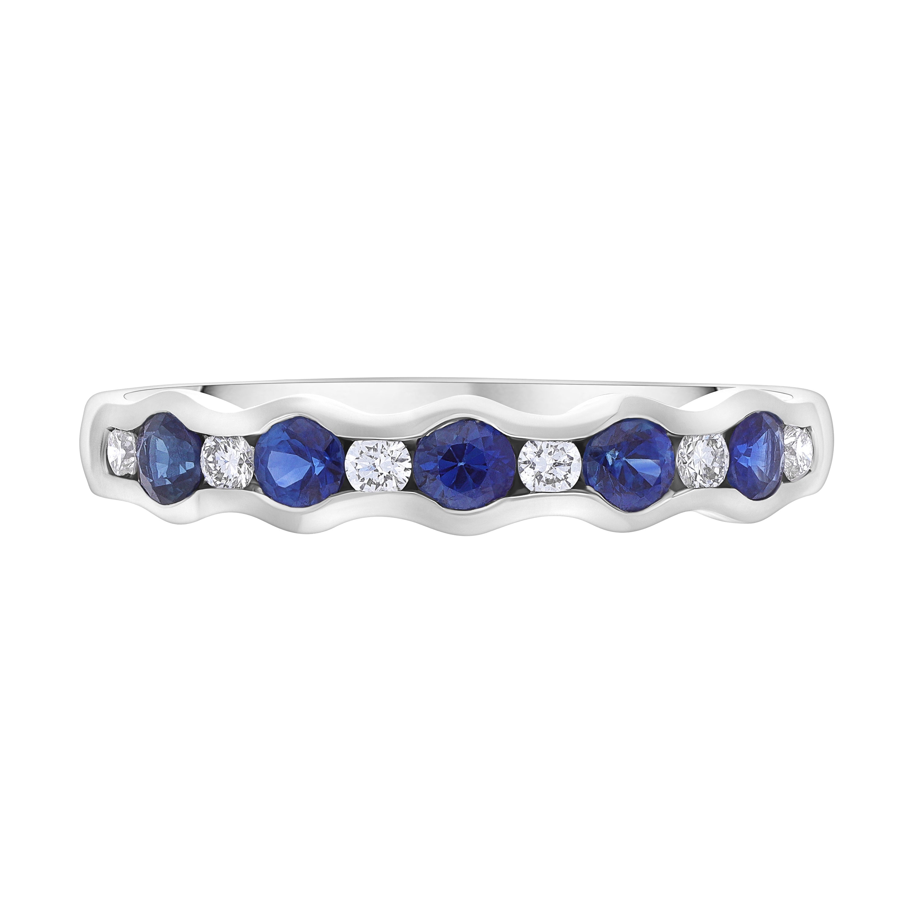 This classic yet contemporary half eternity ring features an alternating 0.48ct blue sapphire gemstone and 0.12ct diamond design, channel set in 18ct white gold, beautifully accentuating the sparkle within the stones. The 18ct white gold band has a subtle wave design, giving this precious gemstone and diamond set ring a unique design.