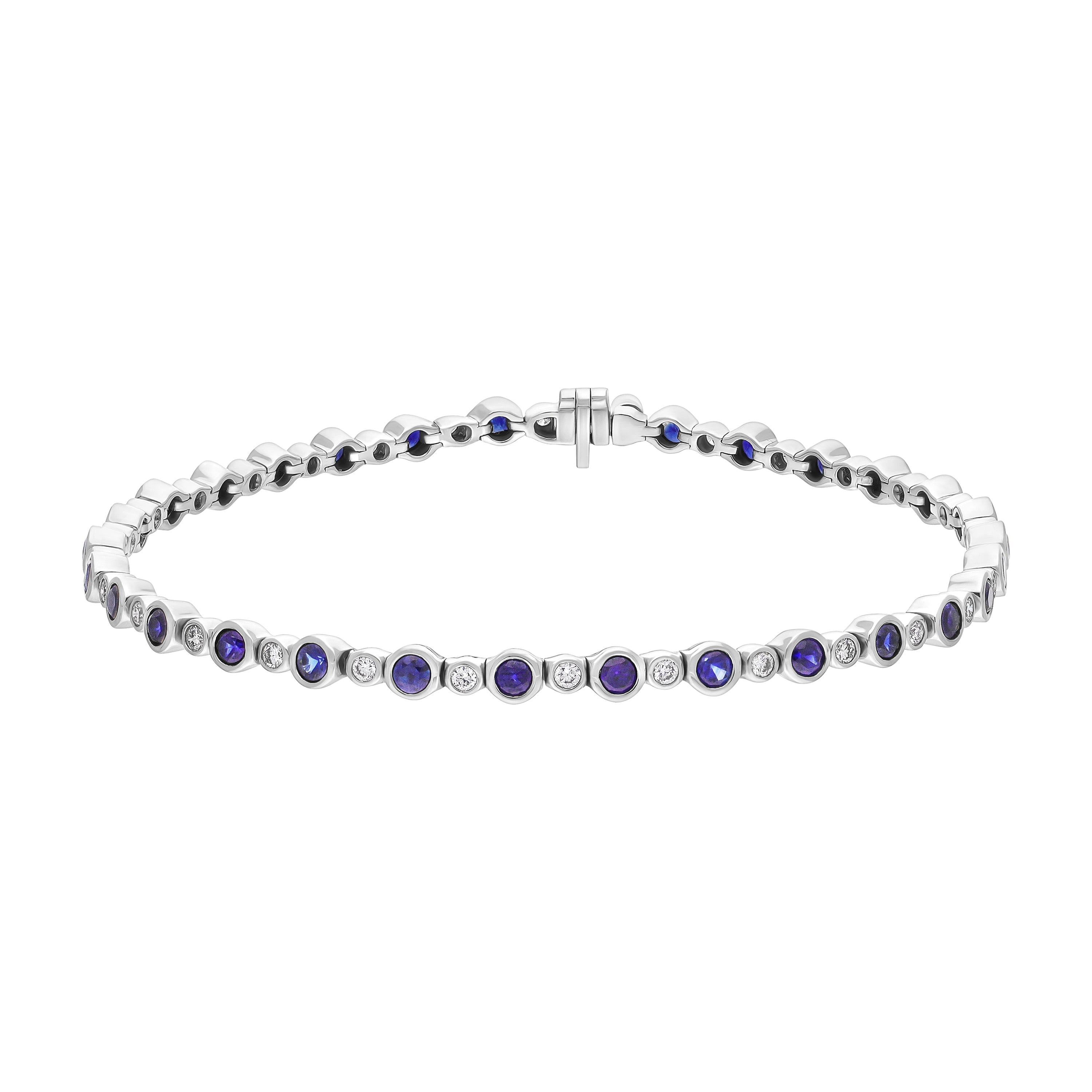 An embodiment of elegance and luxury, this bracelet features 3.13ct blue sapphires and 0.60ct dazzling diamonds, complete with rubover setting in 18ct white gold. The bracelet is beautifully articulated to fit comfortably, secured with a push-in clasp and two safety keepers.