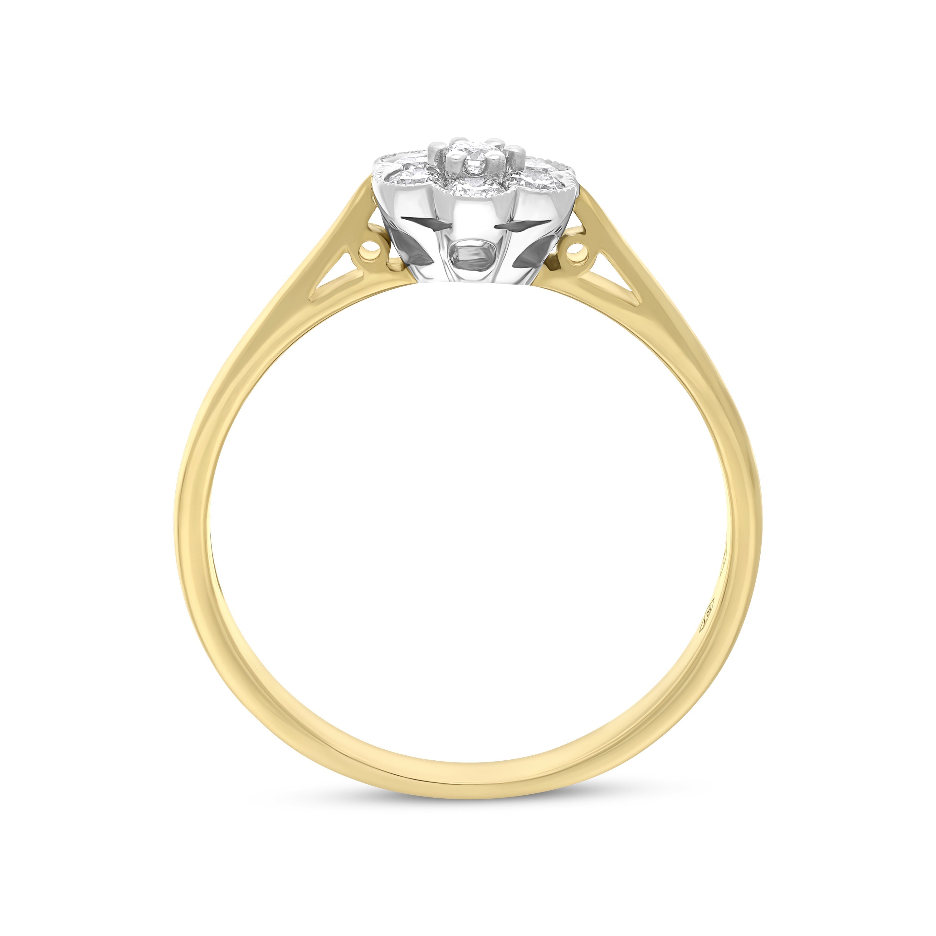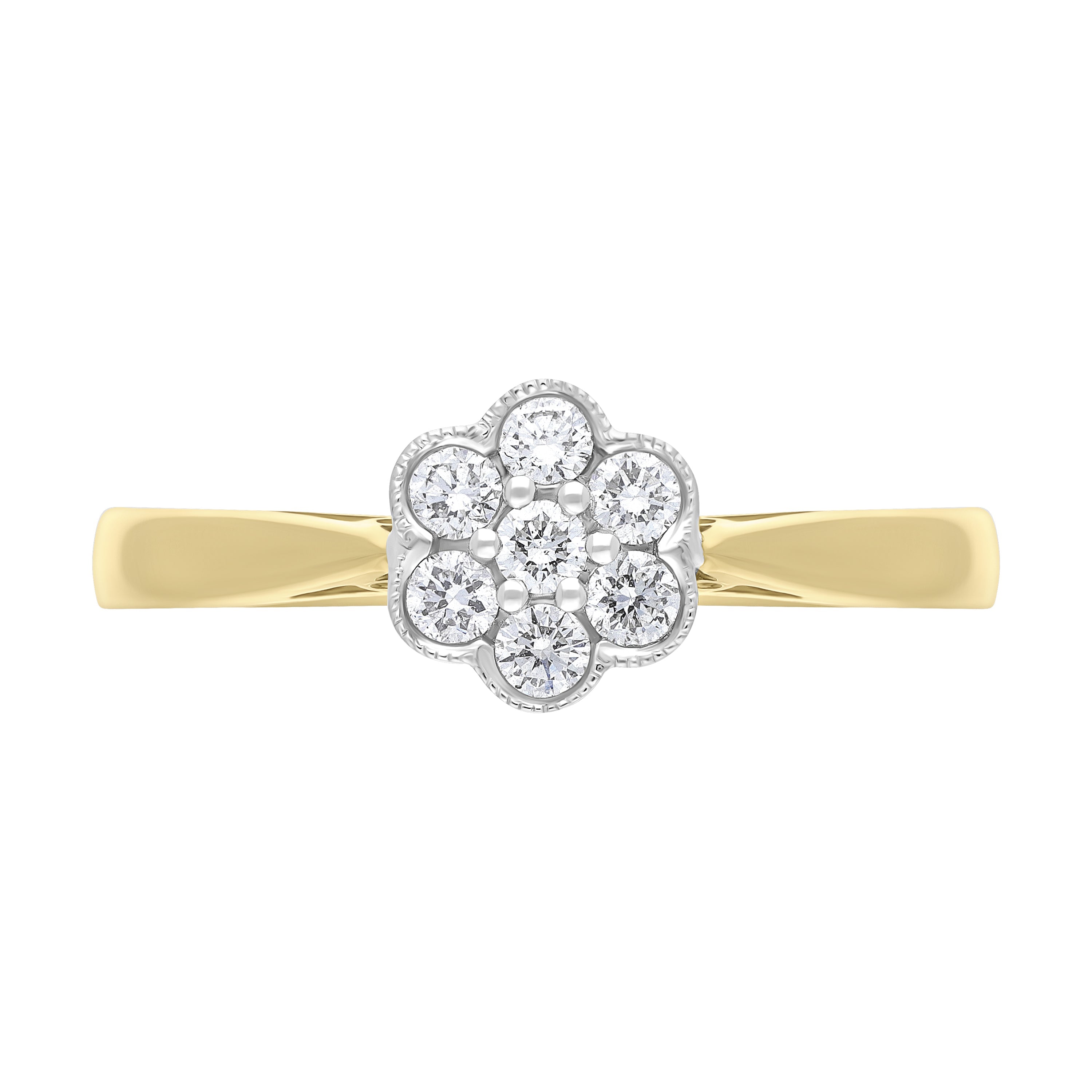 This classically styled 18ct yellow gold ring features an array of sparkling brilliant cut diamonds, totalling 0.23cts, which create this stunning floral cluster design. The precious gemstones are set within 18ct white gold millgrain setting, surrounding the stones with delicate white gold beading and creating a stunning contrast between the two metals. Designed perfectly for everyday wear, this diamond set piece would make the perfect engagement or dress ring to sit comfortably alongside other bands.