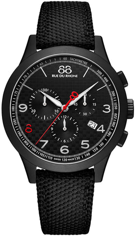 88 Rue Du Rhone Watch Rive 87WA174301. The number 8 carries a rich and diverse array of connotations. Considered a lucky number in Asian cultures, the number eight symbolises good fortune, ambition and power. Doubled, soothsayers see it as a four leaf clover, which is also a widespread symbol for good luck. On the 88 RUE DU RHONE logo, the double 8 represents the face of a watch with the hands indicating 10:10, a nod to the watchmaking tradition. When positioned horizontally, the eight is the mathematical sign for infinity, thanks to the endless flow of curves that feed into one another, forever.