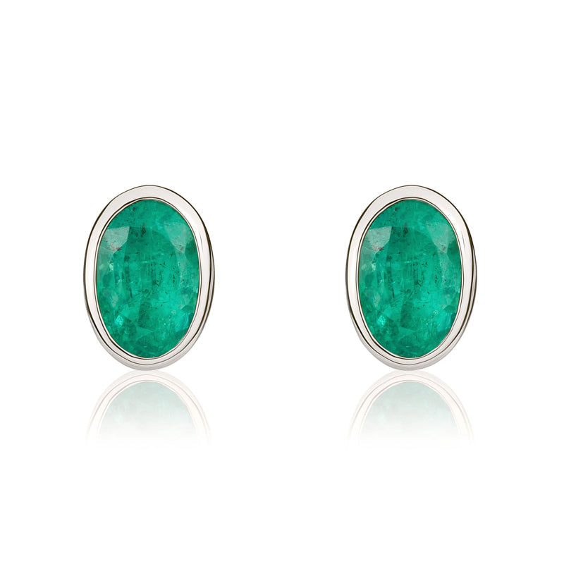 9ct White Gold Emerald 6x4mm Oval Rub Over Set Stud Earrings