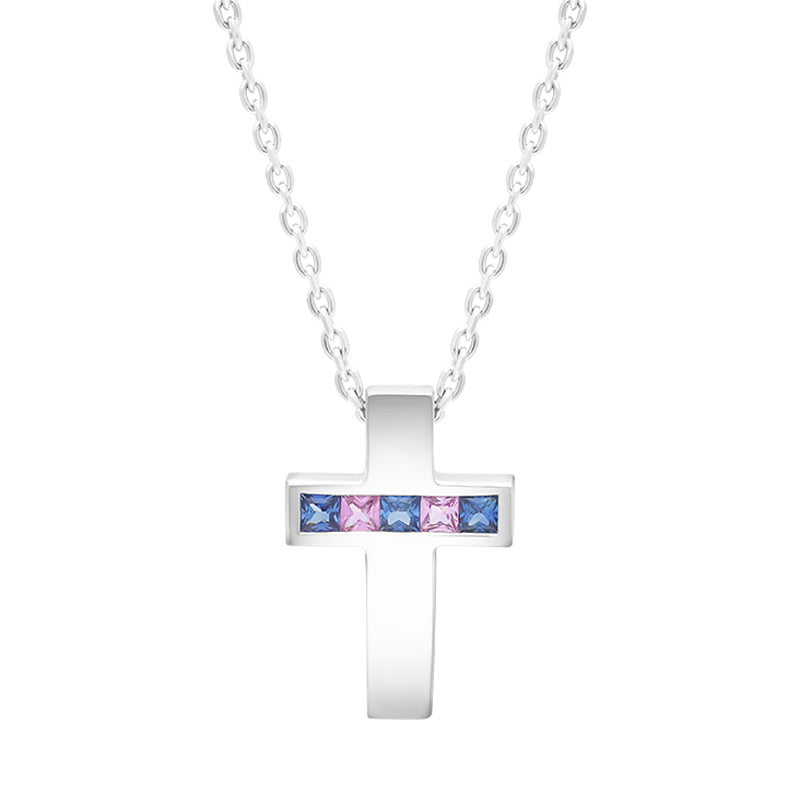 9ct White Gold Pink Blue Sapphire Cross Pendant Necklace, P677.