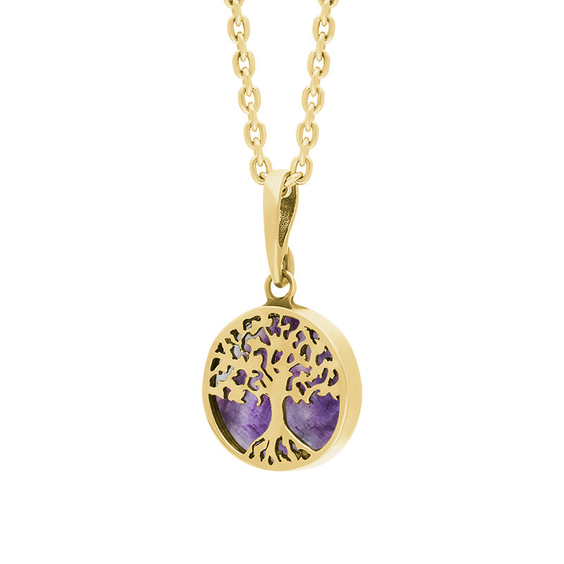 9ct Yellow Gold Small Blue John Round Tree of Life Necklace, P3616.