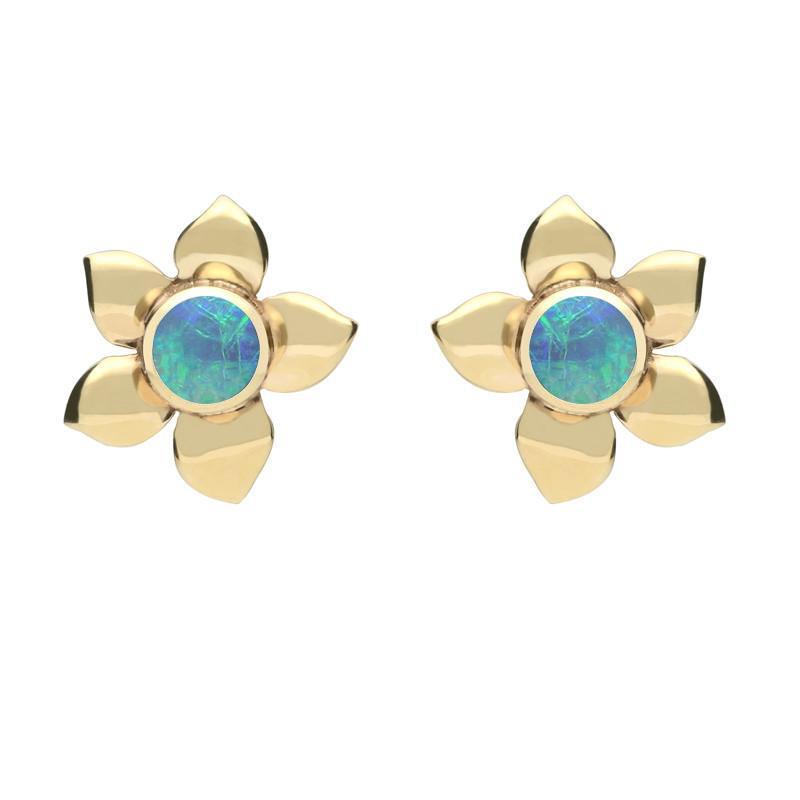 A pair of feminine, flower inspired stud earrings, featuring a small circle of iridescent hand carved Opal, set in the centre of five 9ct yellow gold petals. Secured by 9ct yellow gold post and butterfly fittings.