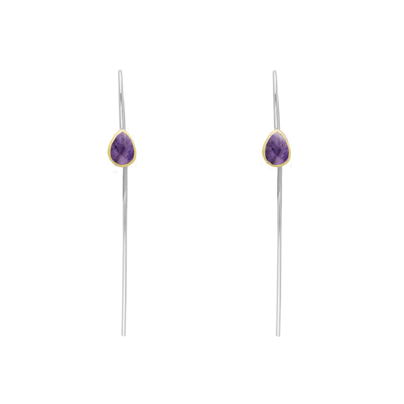 These drop earrings feature highly polished genuine Blue John set in 9ct yellow gold frames with sterling silver hooks for a fresh, modern look.