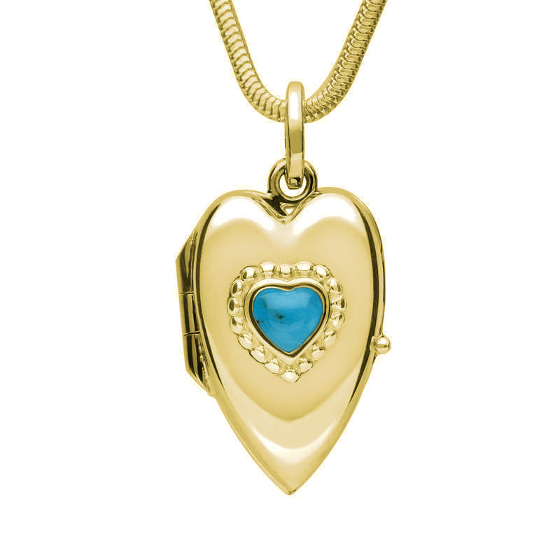 9ct Yellow Gold Turquoise Beaded Edge Heart Locket Necklace