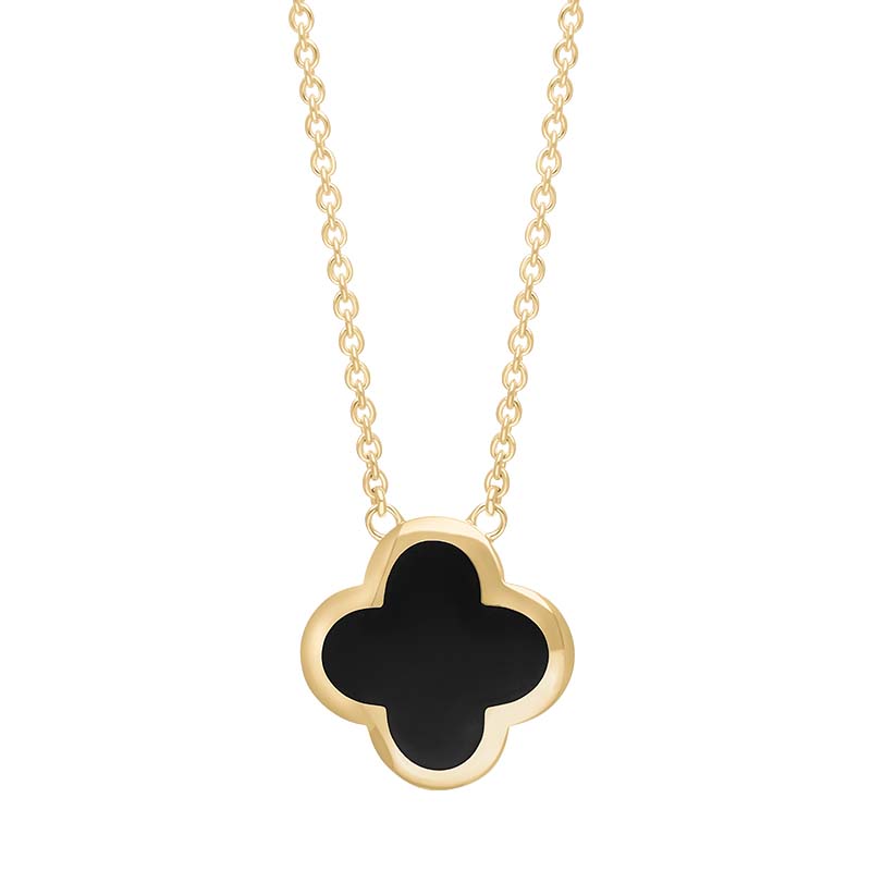9ct Yellow Gold Whitby Jet Bloom Large Four Leaf Clover Polished Edge Pendant - N1153 (BLM-051)