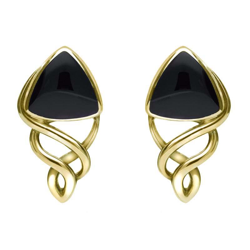 9ct Yellow Gold Whitby Jet Curve Triangle Celtic Stud Earrings, E986.