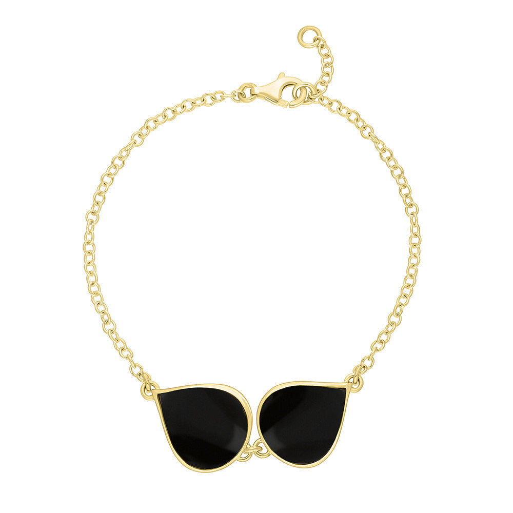 This bracelet is part of Rebecca Sellors' Flore collection, featuring two beautifully crafted teardrop-shaped cabochons of the finest Whitby Jet stone which has been sourced locally from the Whitby coastline, North Yorkshire. Encased within an intricate 9ct yellow gold filigree design, this piece is complete with a classic chain which fastens with a lobster clasp, ensuring a secure and comfortable fit.