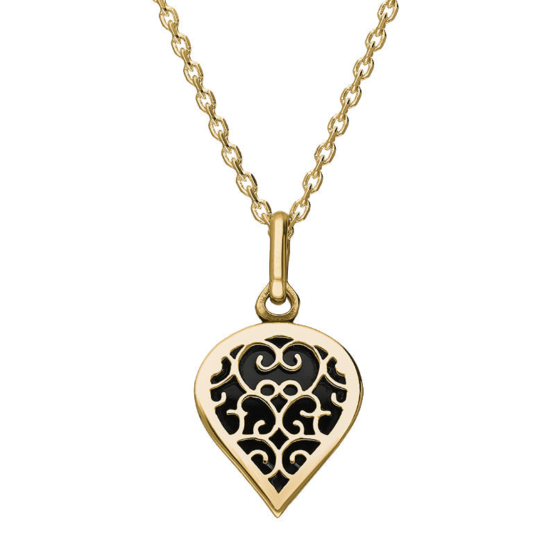 9ct Yellow Gold Whitby Jet Flore Filigree Small Heart Necklace - P3629 (FLR-015)
