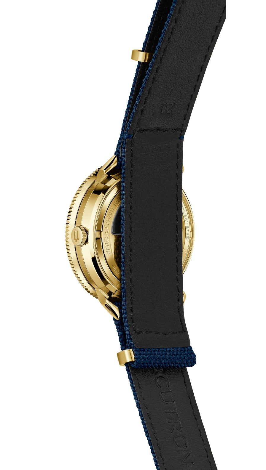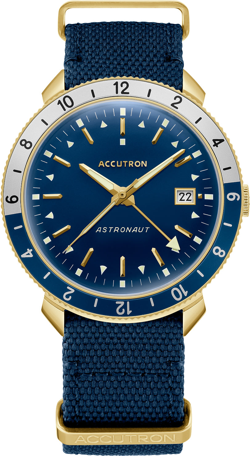Accutron Watch Astronaut T 27B202. Accutron Watch Astronaut T 27B202. Accutron is proud to introduce a new addition to their storied Astronaut collection, honoring the original 1968 model. Staying true to the distinctive design of the original version, this new Astronaut features a striking navy dial and distinctive matching navy day/night bezel. Featuring gold tone hour hands, hour markers and a date display window, this Astronaut is outfitted with a matching navy cordura nylon NATO strap and features the Accutron Caliber 9058 GMT automatic movement with a 50 hour power reserve at 28,800 BPH and anti magnetic resistance up to 16,000 a/m.