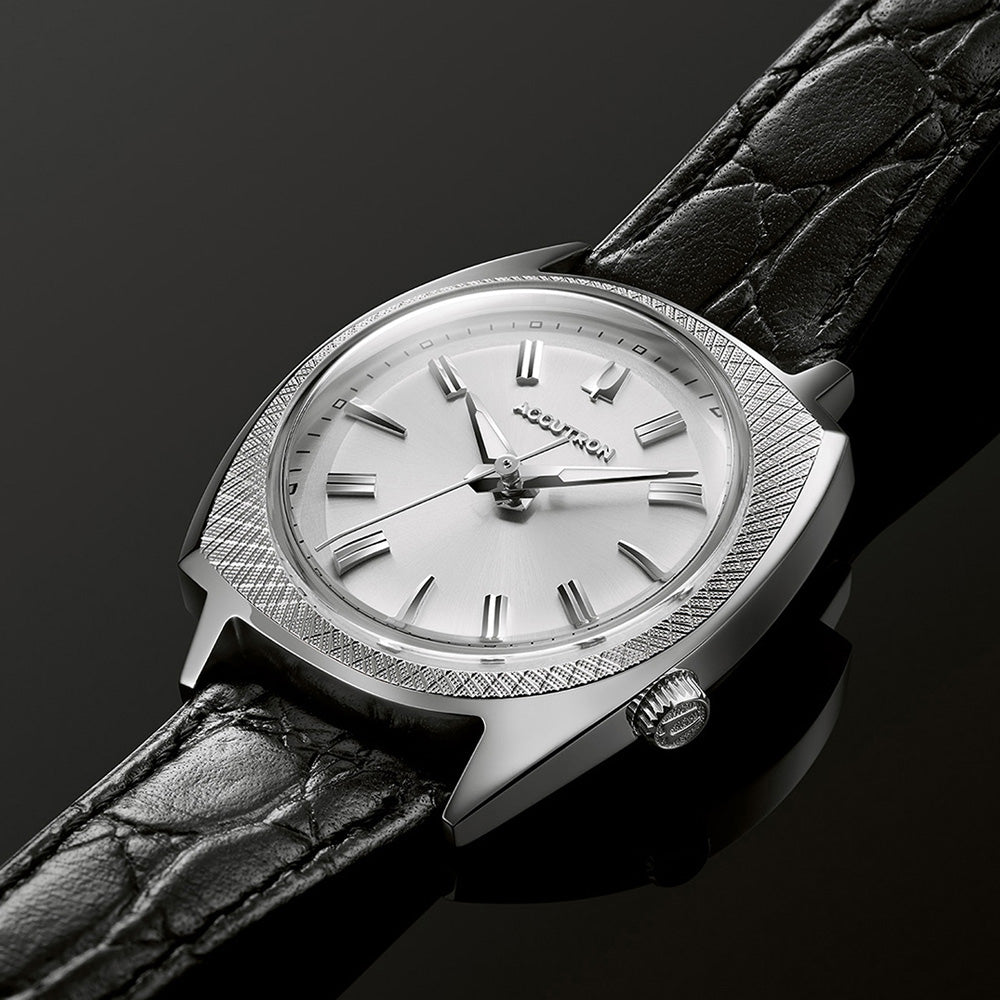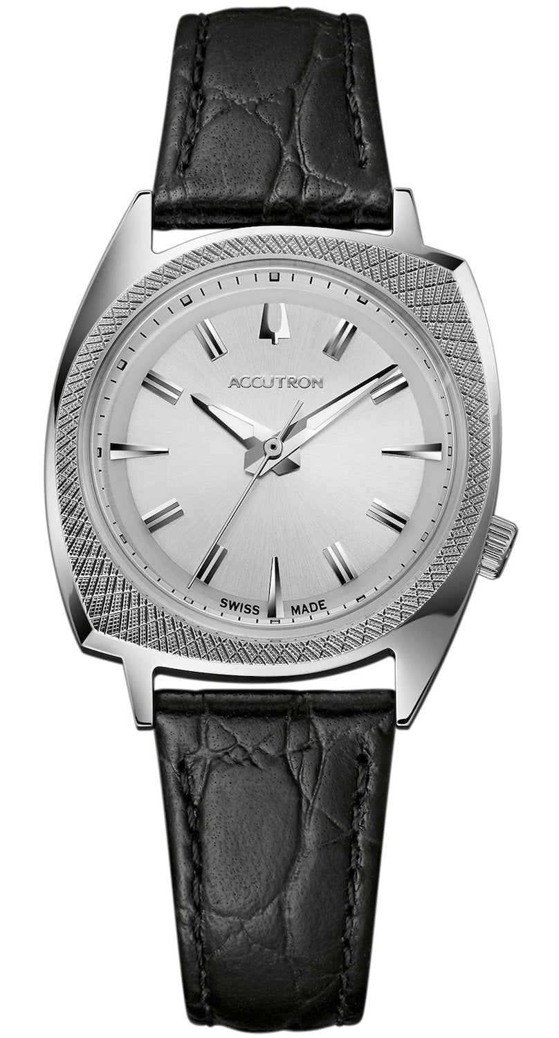Accutron Watch Automatic Legacy Limited Edition 2SW6A002. First launched in 1966, the 565 from Accutron turned heads and made a statement. Today, this Legacy collection timepiece harkens back to that era, reimagining the classic with an updated Swiss made 26 jewel automatic movement to guarantee quality and reliability. A unique cross hatching detail was added to the already visually distinctive asymmetrical case design, and the silver tone stainless steel case features a 3 hand silver white dial, bold hour markers and an outer minutes ring, finished off with a black croco embossed leather strap. Classic luxury with timeless appeal youll never blend into the background.