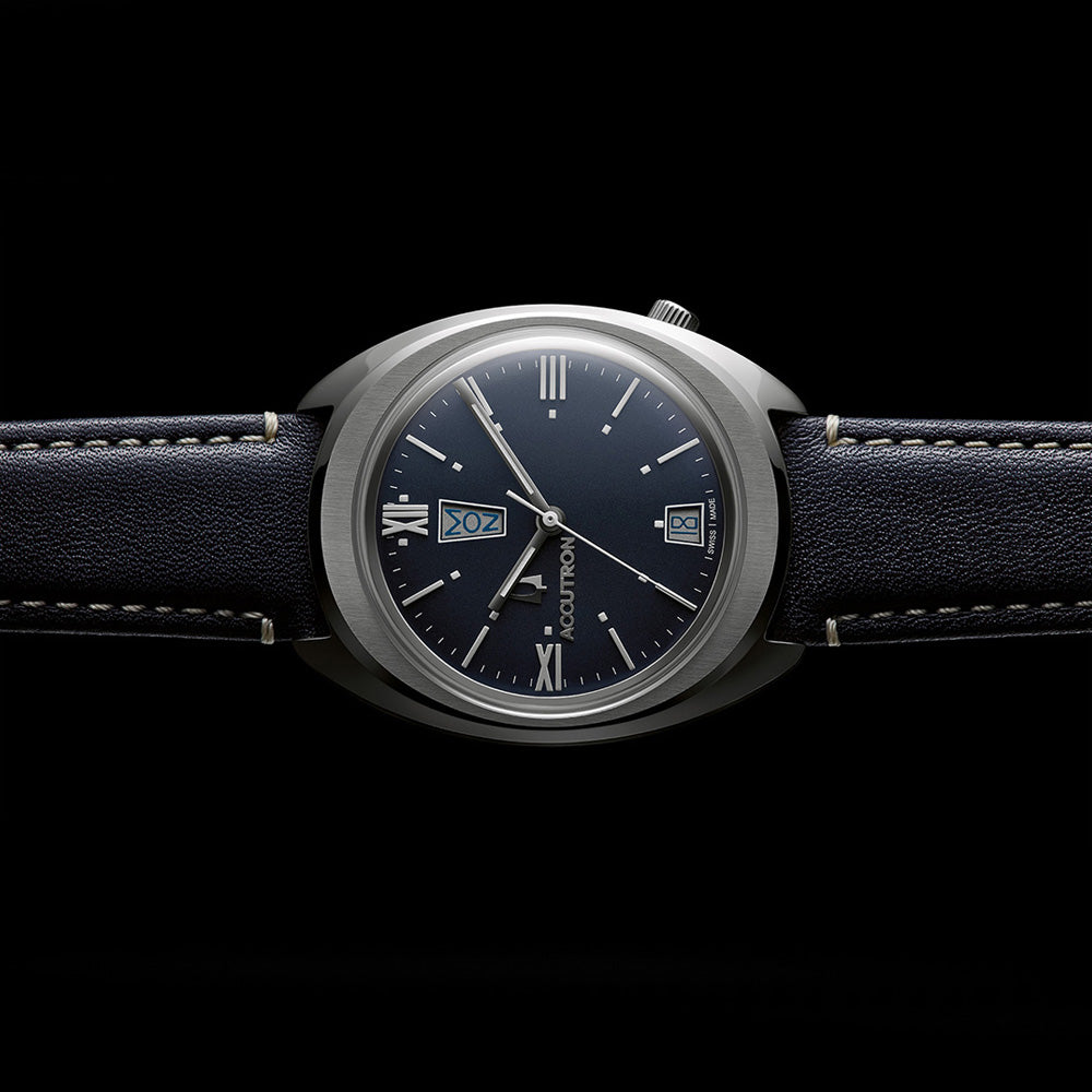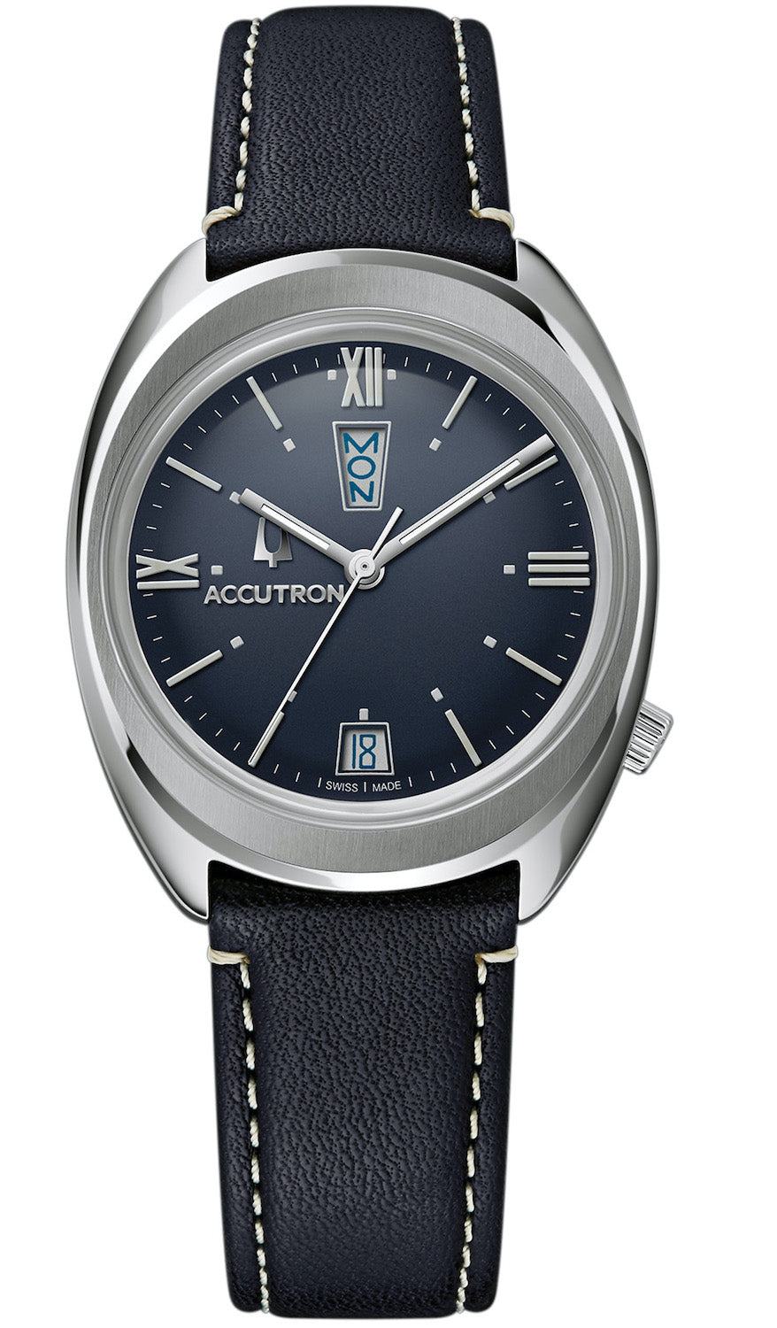 Accutron Watch Automatic Legacy Limited Edition 2SW6C001. This Accutron limited edition Legacy collection timepiece reimagines a classic watch from 1960, the Date and Day Q. With just 600 pieces available, this exclusive luxury timepiece with Swiss made 26 jewel automatic movement features a beautifully streamlined oval case design and crown placement at 4 oclock, a silver tone stainless steel case and dark blue dial, and grey applied Roman numerals and blueaccented day/date feature. The look is capped off with a white accent stitched dark blue leather grain strap. Reborn from the past, and built for the future, this watch will make a statement everywhere it goes.