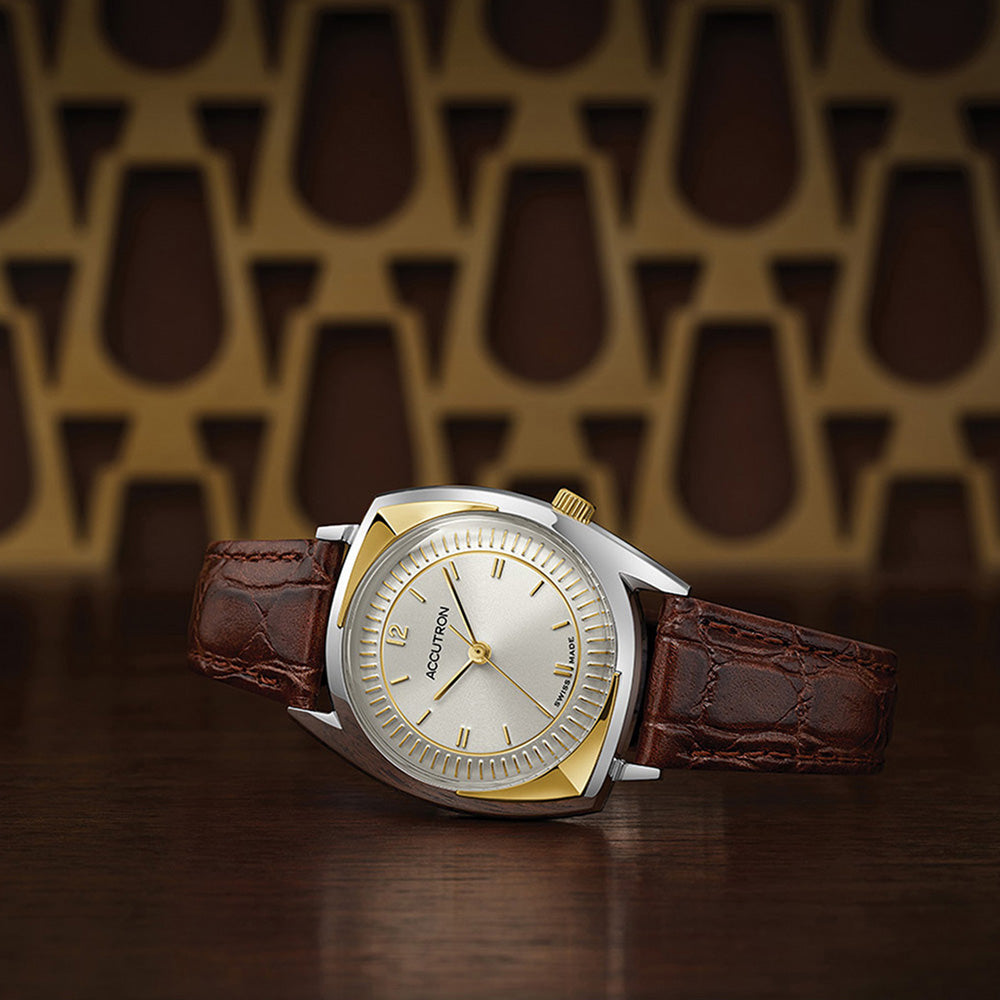 Accutron Watch Automatic Legacy Limited Edition 2SW8A001. Taking its design from the iconic 203 from the 1960s, this Accutron Legacy collection watch is visually striking with its distinctive asymmetrical case design. The gold and silver tone stainless steel case features a 3 hand champagne dial, Arabic numerals, and fine line stick markers on the outer ring. It has a brown croco embossed leather strap with a double press closure, and uses a Swiss made 26 jewel automatic movement for quality and reliability in a luxury timepiece today. You arent content to blend into the background your watch shouldnt either. With this eye catching, limited edition timepiece, youre sure to stand out.