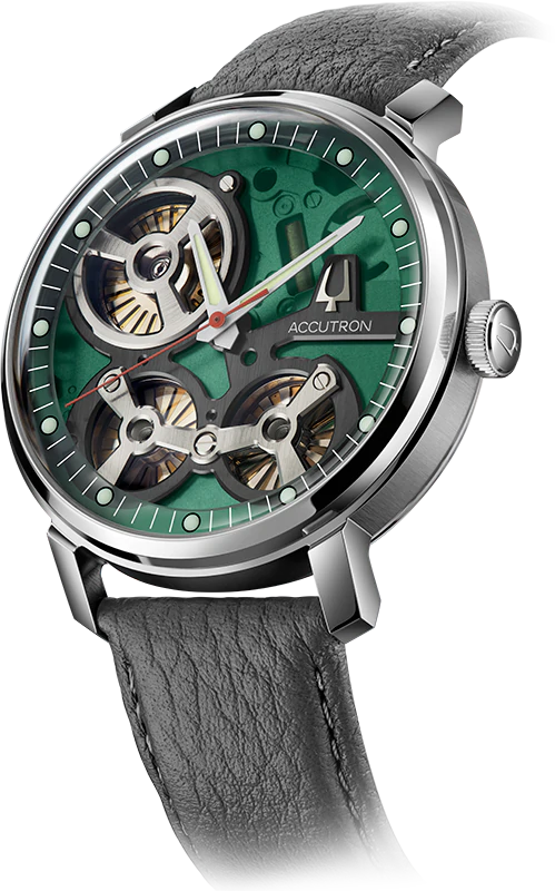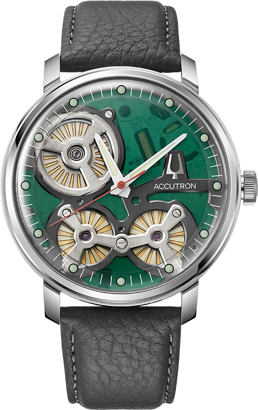 With Accutrons Spaceview 2020, time has just changed again. This luxury watch for men re imagines what a timepiece can be with the proprietary electrostatic movement, unique to the Accutron line, an intricately engineered motor and turbine system that generates power. And it isnt shy about showing it off, with its signature open face dial in smokey grey and eye catching Accutron green accents. It further shows off its style with white hour and minute hands and an orange second hand, with a transparent outer ring, topped off with a luxurious, grained black leather strap. This is a mens watch that is designed to be as individual as you are.