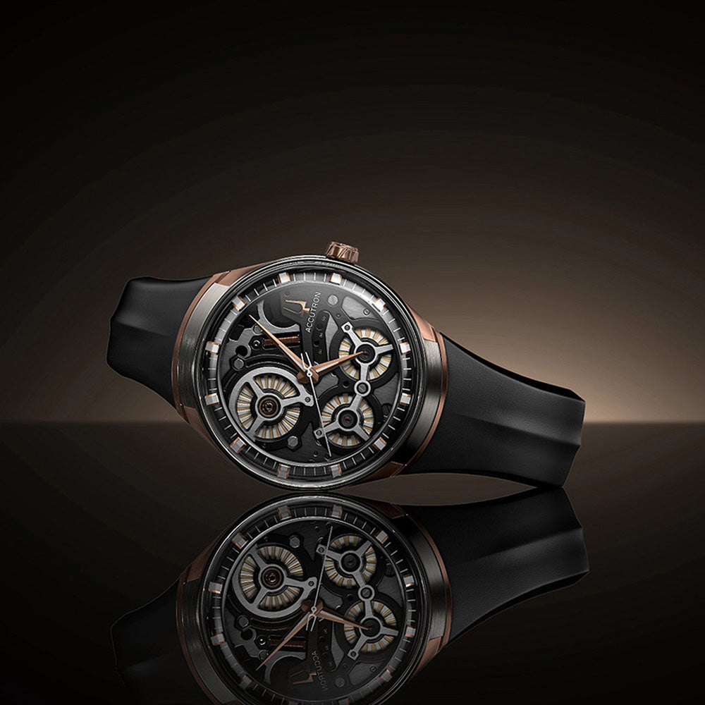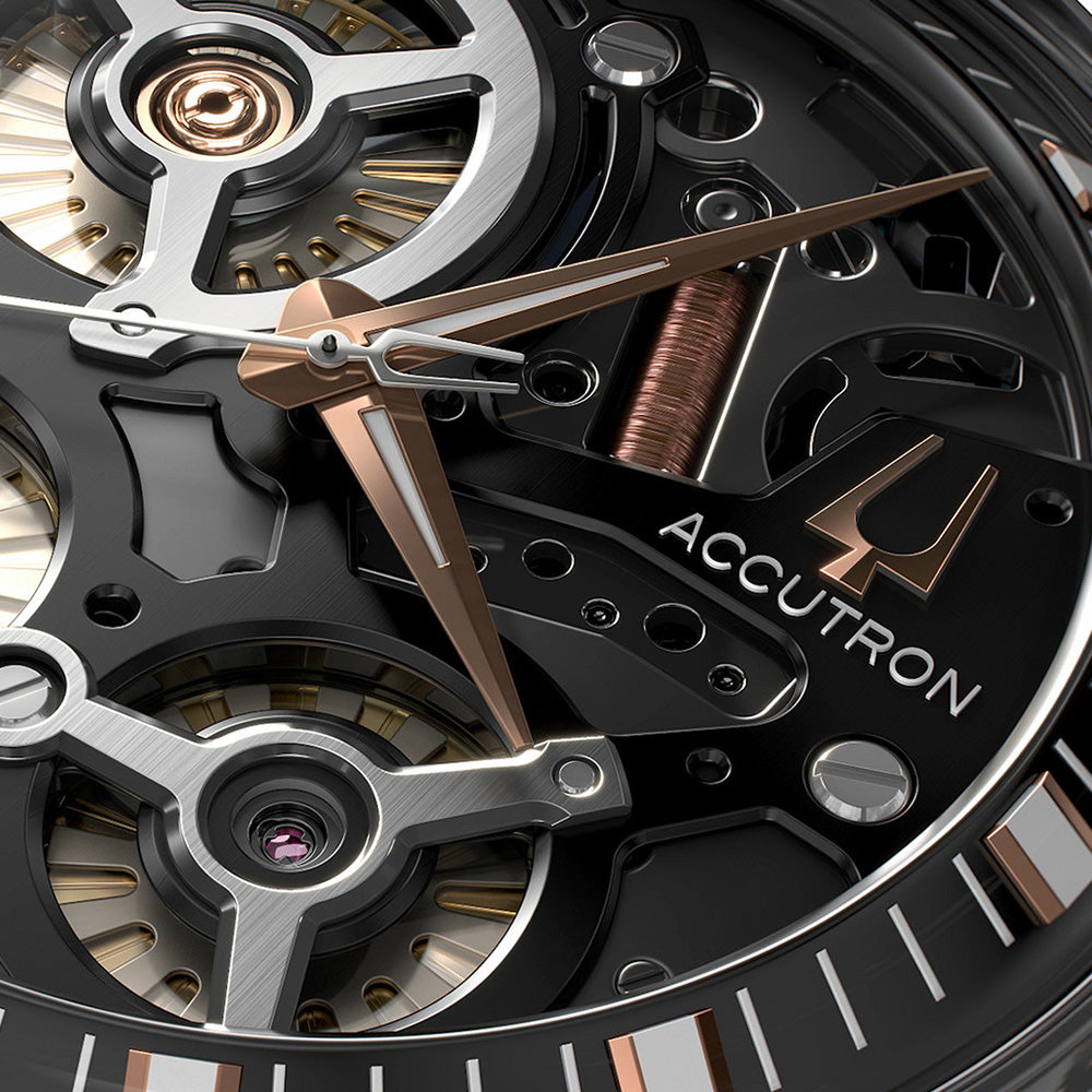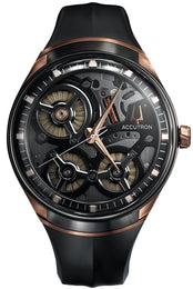 Accutron Watch Electrostatic Spaceview DNA 2ES8A002. With a skeleton dial showcasing the precision of Accutrons proprietary electrostatic energy movement and intricately engineered motor and turbine system, the Accutron DNA is a luxury mens watch for those who dont follow others paths they blaze new trails. The stainless steel two tone, rose gold tone and grey watch features a muted grey detail on the outer hour/minute ring, which complements the black open face dial, and rose gold tone hands, crown, and bezel, all topped with a domed sapphire crystal. It is finished with a black rubber strap with a double press closure.
