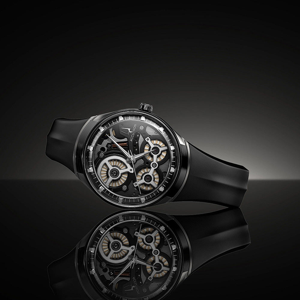 Accutron Watch Electrostatic Spaceview DNA 2ES8A003. Reborn from one of the brightest parts of history, the Accutron DNA is a luxury mens watch that will never fade into the background. The stainless steel case is a combination of a matte black and muted grey finish, with a stamped Accutron logo and turbine design on the case back. On the front, muted grey details on the outer ring complement the matte black open face dial, hands, crown, and bezel. It is all finished off with a perfect sporty black rubber strap to complete the sleek and sophisticated look.