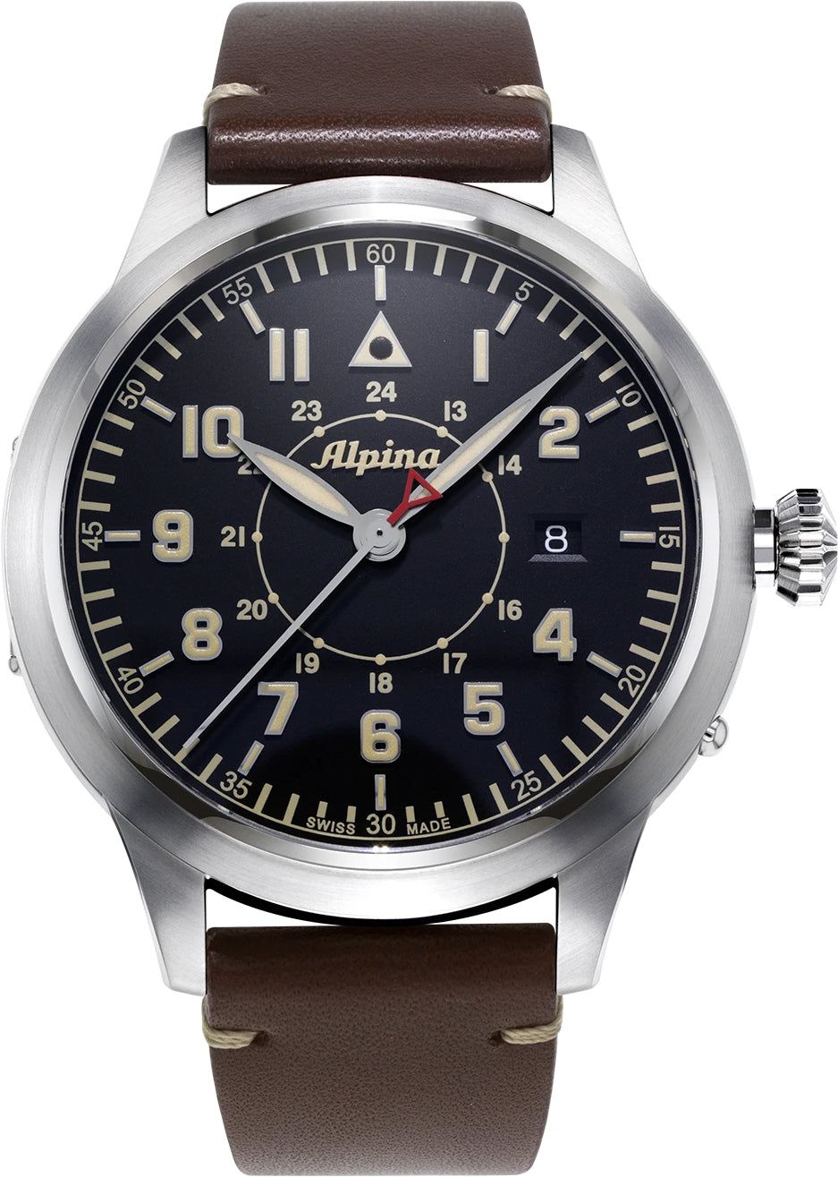 Alpina Startimer Pilot Chronograph Big Date AL-525BBG4SH6. Founded in 1883, Alpina, famous for its signature red triangle, is a fine watchmaking manufacture based in Geneva, Switzerland with a history spanning more than 135 years. A true pioneer of the Swiss watchmaking industry, Alpina has been the source of numerous patents and innovative calibers. Alpina invented the concept of the Swiss sports watch as we know it today, with the creation of its legendary Alpina 4.