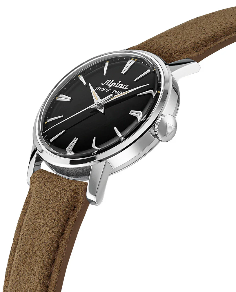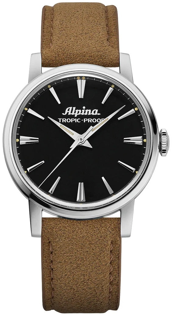 The Alpina Heritage Tropic Proof watch reference AL-480B2H6 is crafted from polished stainless steel to uphold its dress watch appeal and features a domed sapphire glass, which replaces the original acrylic crystal. It also features a stylish tan Alacantara strap that secures around the wrist with a stainless steel pin buckle. Additional features include a 30 meter water resistance, Super LumiNova coated dauphine hands, and a closed caseback that conceals a hand winding movement behind its Alpina engraved inscription.