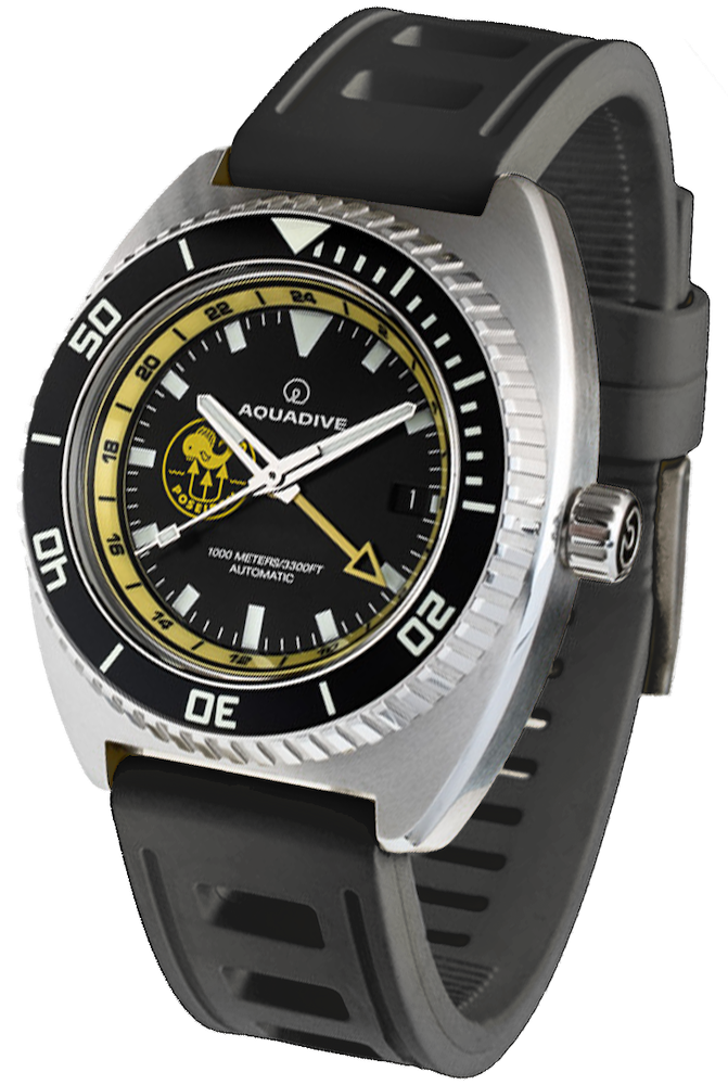 Aquadive Watch Poseidon GMT Divers Limited Edition. With the Aquadive watches Poseidon, two great diving names are together on the dial of a watch that symbolizes rugged innovation and underwater adventure. There are a few names that have become legendary in the history of underwater exploration, brands relied on by divers for their innovation and reliability. In the 1960s, Aquadive emerged from a crowded field to become the choice of serious ocean explorers, thanks to developments like one of the first 1000 meter rated watches and the integrated depth gauge. Around the same time, Poseidon Diving Systems became another trusted leader, introducing the first single hose regulator, and developing a sealing system for cold water diving. Poseidon, fittingly named for the ancient God of the Sea, remains one of the best known and relied upon brands of diving equipment.