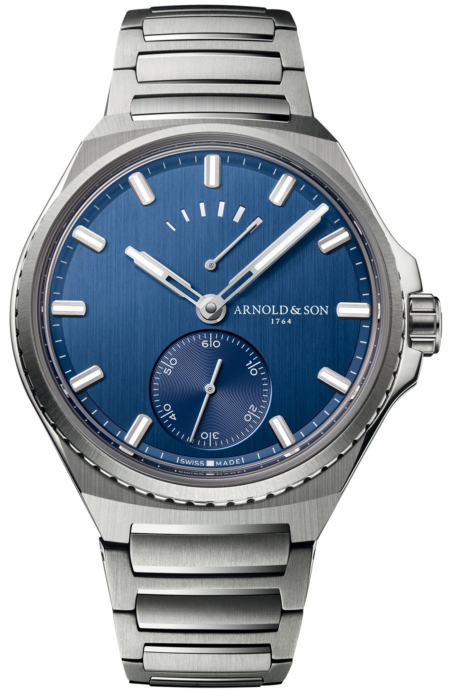 Arnold & Son Watch Longitude Titanium Ocean Blue 1LTAT.U01A.N001U. Longitude Titanium is a sports chic COSC certified chronometer with a 42.5mm titanium case. The dial of Longitude Titanium is vertical satin-finished in a continuation of the bracelets finish, which is subtly intersected by the polished edges of its links. With a power-reserve display at 12 o clock and an imposing seconds counter at 6 o clock, Longitude Titanium pays tribute to John Arnolds marine chronometers, his revolutionary vision and his decisive role in calculating longitude at sea.