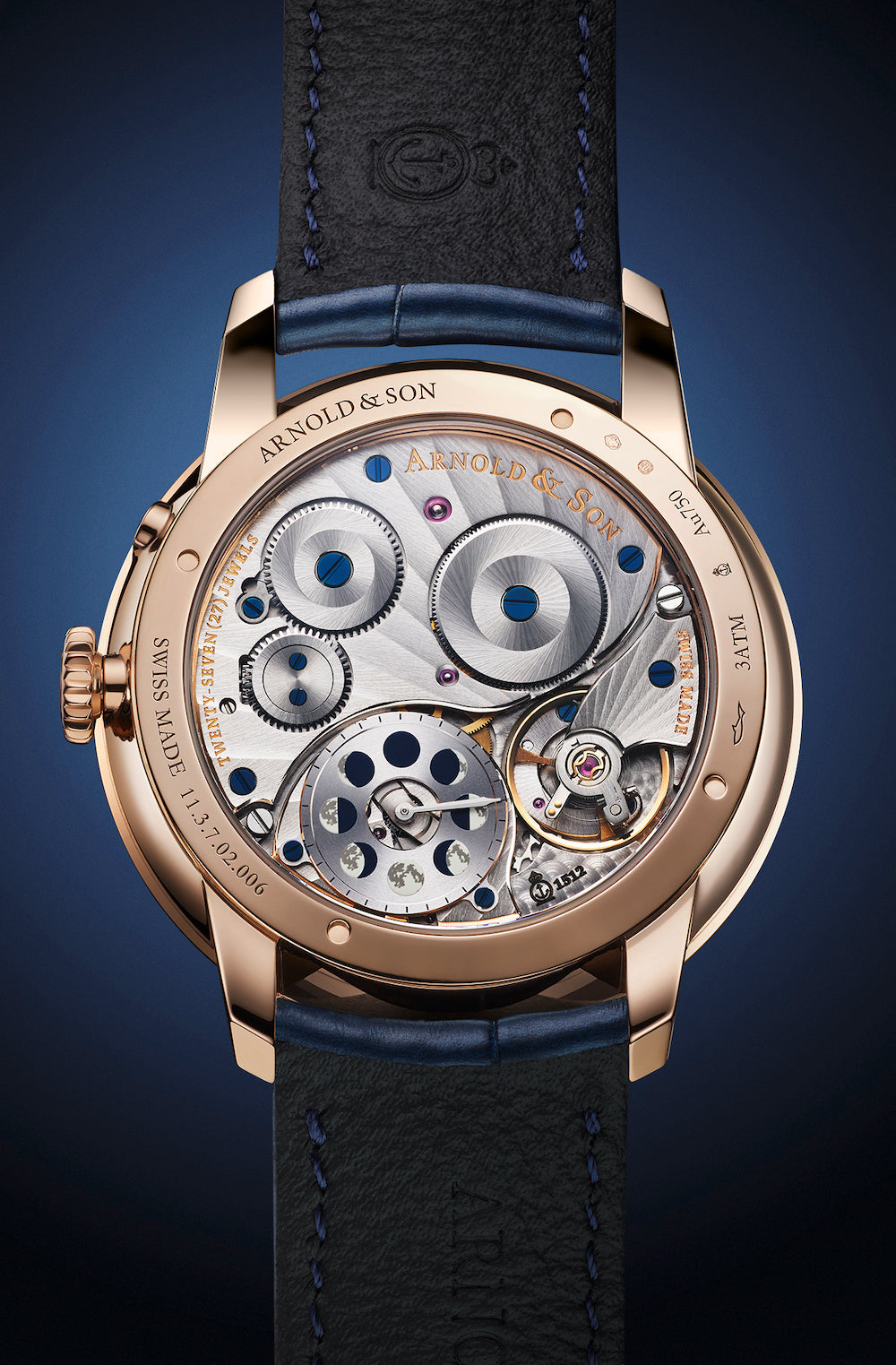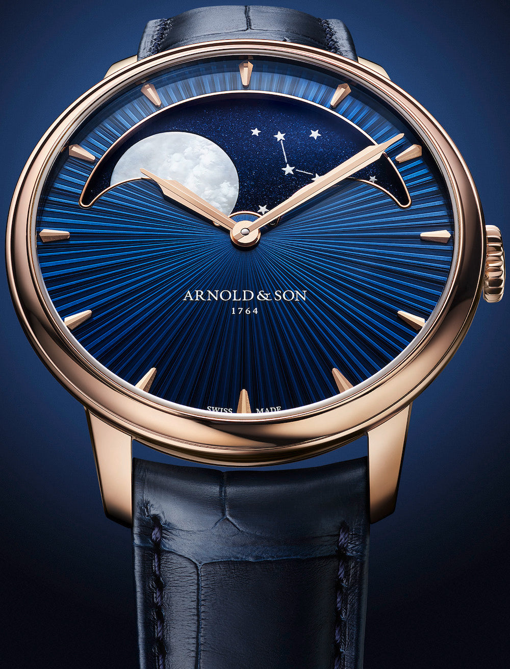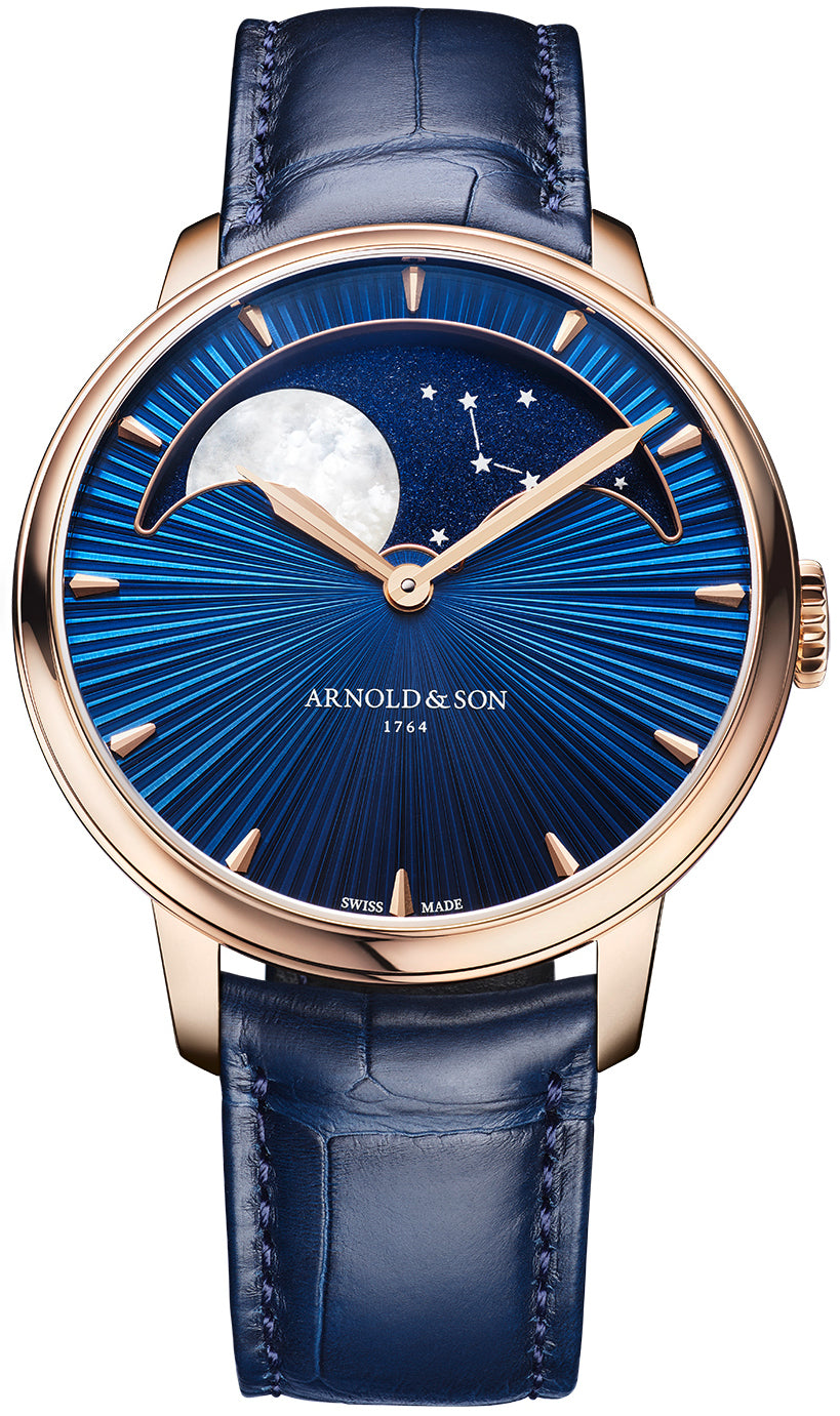 Arnold & Son Watch Perpetual Moon 41.5 Red Gold 1GLBR.U01A.C200A. A white mother of pearl star in a midnight blue sky. The astronomical moon phases showcase Arnold & Sons creativity and aesthetic flair. Perpetual Moon 41.5 is presented in two interpretations, in red gold and platinum. Its dial features a unique motif, Stellar Rays, as befits this astronomical complication.