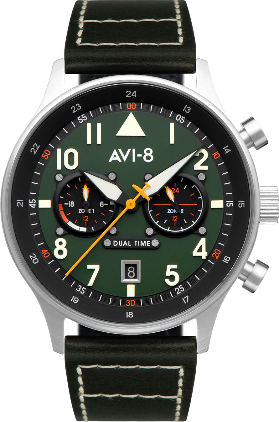 AVI-8 Watch Hawker Hurricane Carey Dual Time Merville AV-4088-02. The best engineers, scientists, designers and pilots have combined over the years to produce cutting edge machines that were designed for the crucial purpose of a country's defense. Drawing on the absolute best in materials and resources, a series of iconic planes have emerged over the years that serve as a benchmark to look upon in mans progress in the sky. AVI-8 watches seeks to honor both the aircraft and the untold story of the airmen who have dedicated themselves both in and out of the cockpit to bring these incredible machines to life.