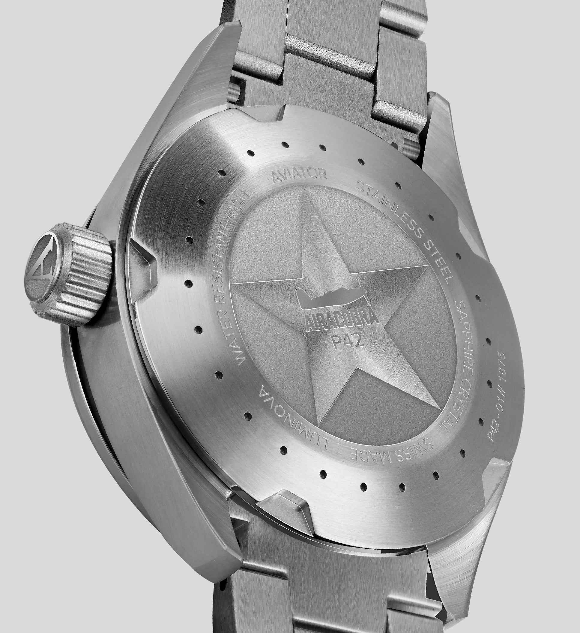 Aviator Watch Airacobra Mens V.1.22.0.148.5. From the start of the Second World War, aircrafts were crucial to the success of army operations, supporting troops from the sky. The Airacobra was one of the best fighters of its time, with especially effective ground attack capabilities, making it a valuable addition to the infantry. During the Second World War, aviators began receiving watches as part of the indispensable equipment for missions.